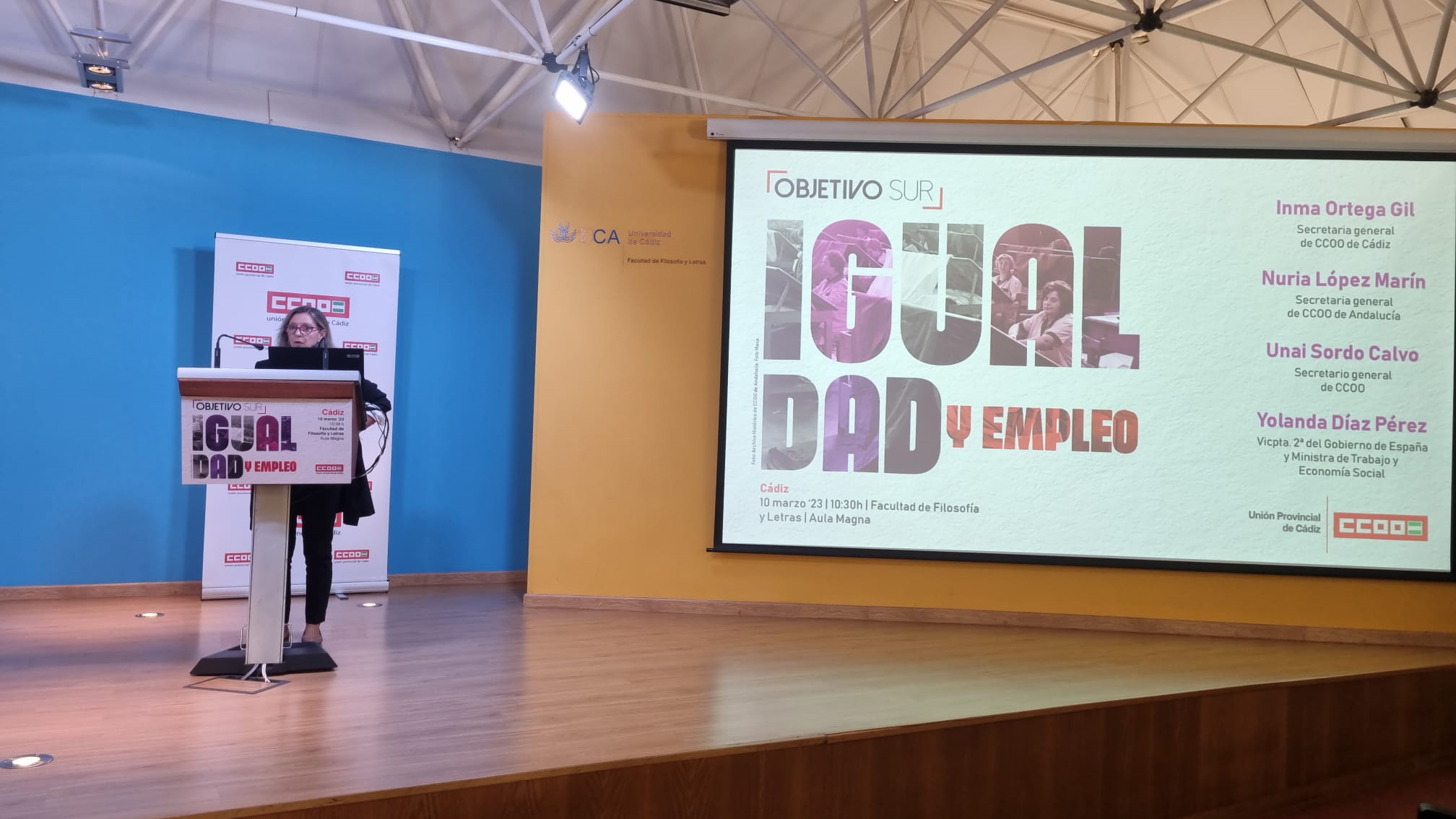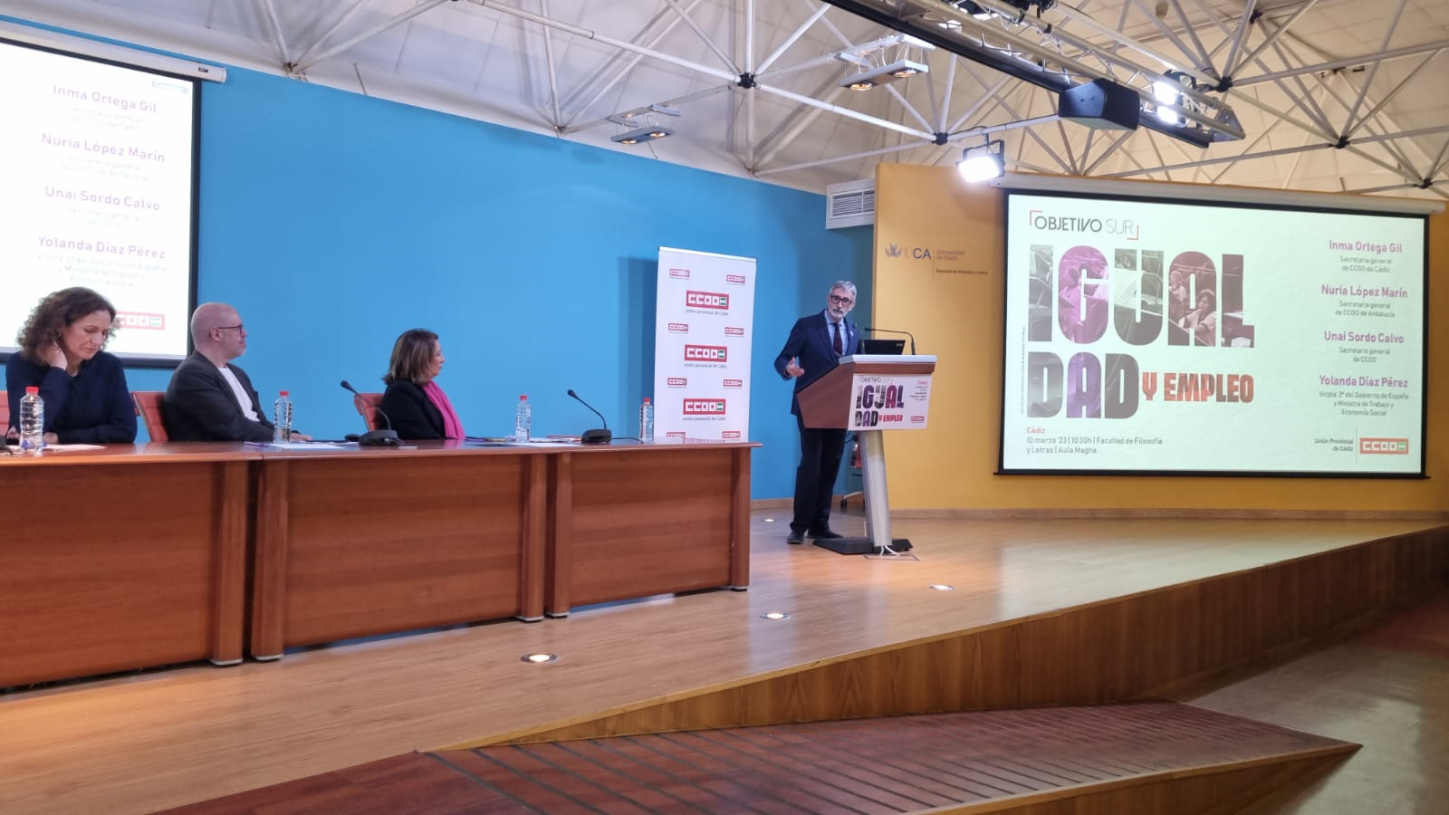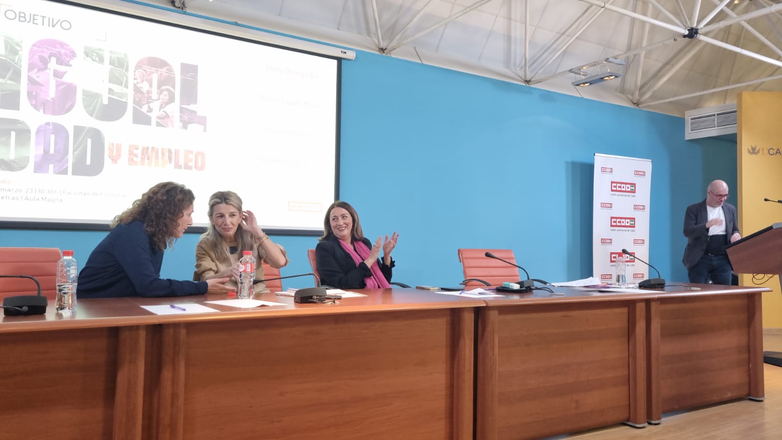 La Universidad de Cádiz acoge hoy, en su Facultad de Filosofía y Letras, la jornada Igualdad y Empleo de Comisiones Obreras (CCOO) en Cádiz. La vicepresidenta del Gobierno de España y y ministra de Trabajo y Economía Social, Yolanda Díaz, ha presidido el acto inaugural en compañía del rector de la UCA, Francisco Piniella, del secretario General de CCOO Confederal, Unai Sordo, la secretaria General de CCOO-A, Nuria López, y la secretaria General de U.P. de CCOO Cádiz, Inmaculada Ortega.