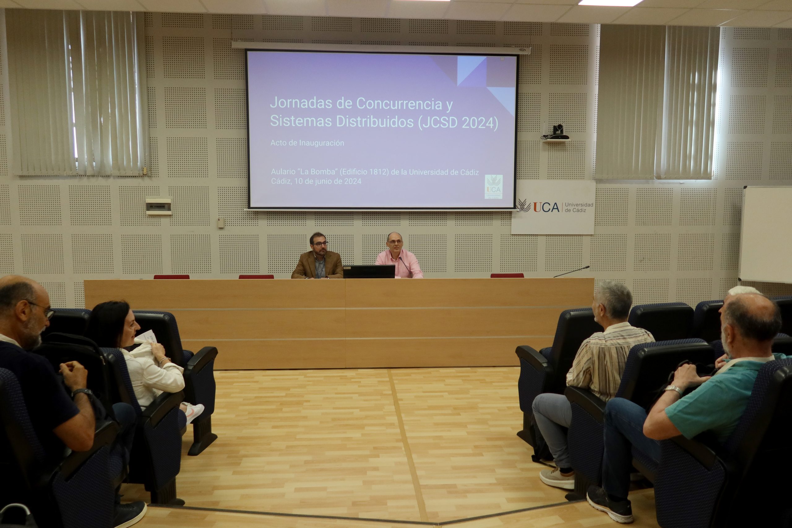 Profesorado de las universidades de Cádiz y Complutense de Madrid organiza las Jornadas de Concurrencia y Sistemas Distribuidos (JCSD 2024) en el edificio Constitución 1812 de Cádiz. 40 especialistas de universidades españolas e internacionales se reúnen en la UCA para compartir sus últimos estudios y resultados en aplicaciones informáticas. El presidente del comité Organizador, Juan Boubeta, junto al director del departamento de Ingeniería Informática de la UCA, Bernardo Miguel Núñez, les han dado la bienvenida en la sala Argüelles.