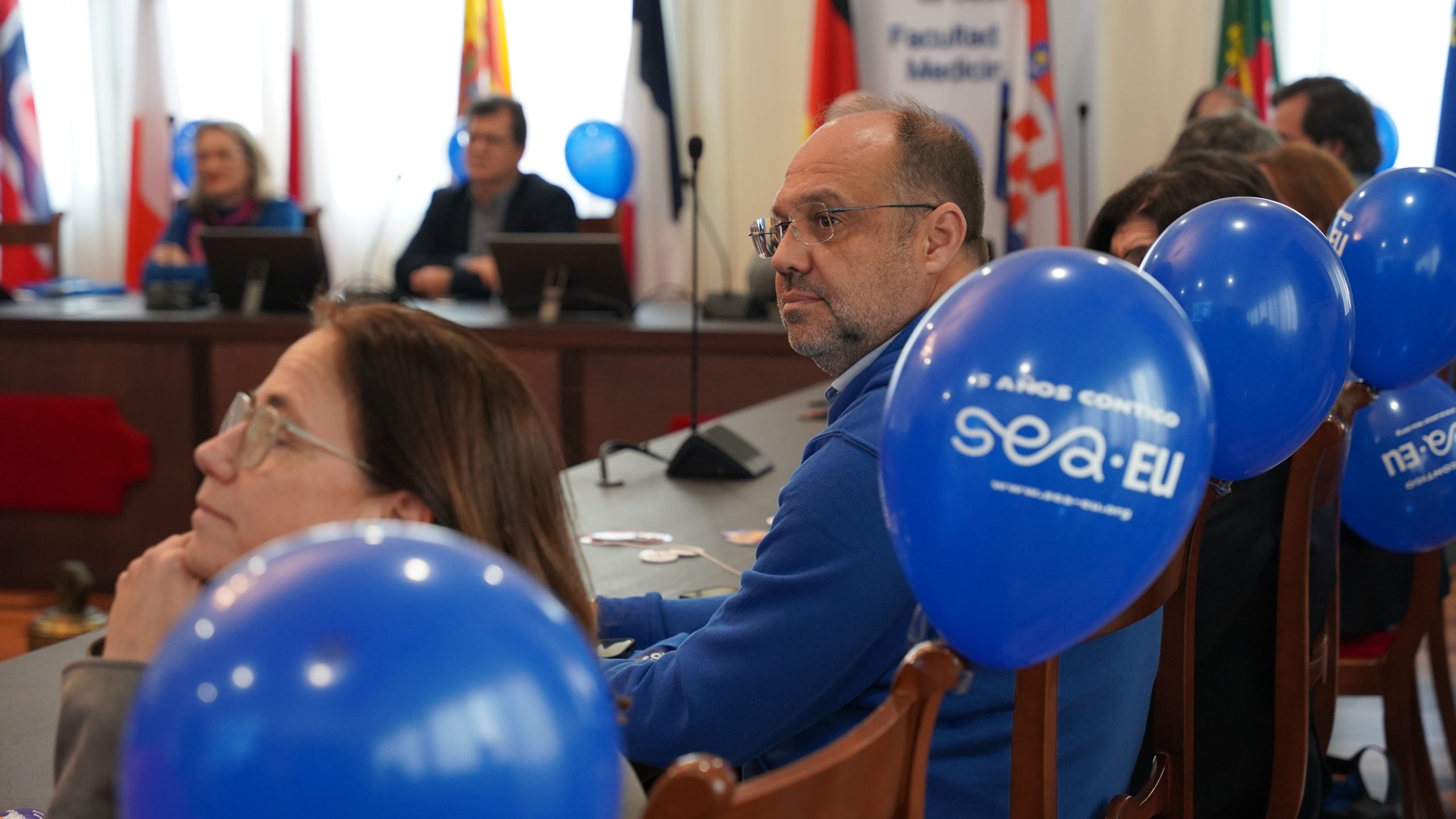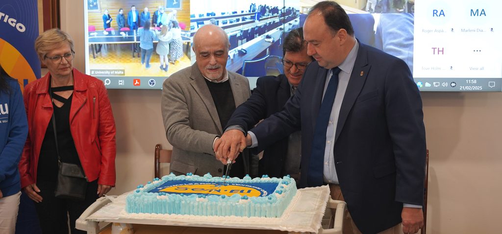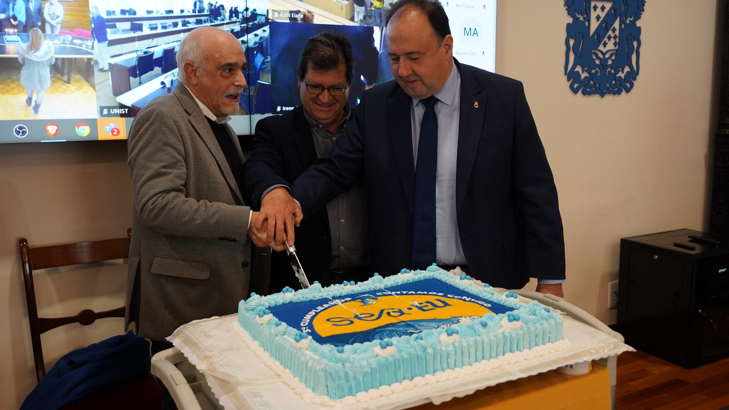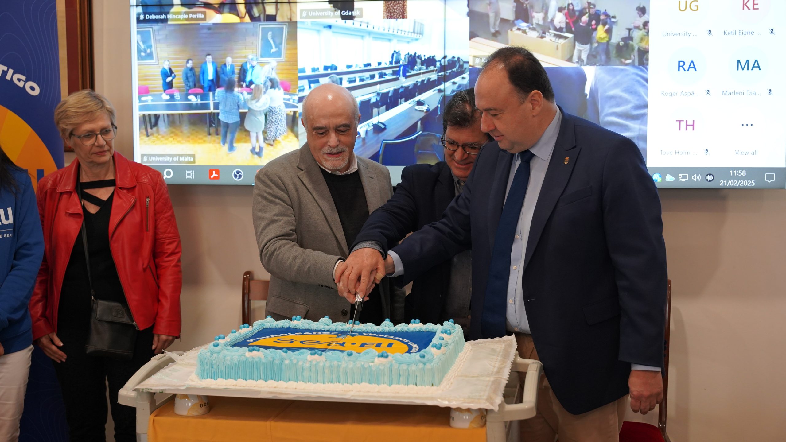 Simultáneamente, en el Salón de Actos de la Facultad de Medicina, el rector Casimiro Mantell ha presidido un acto institucional, acompañado por otros miembros del equipo de gobierno, representantes de stakeholders y personas implicadas en el proyecto SEA-EU. Unas 50 personas han participado en este encuentro que, tras la conexión con las demás universidades, ha culminado con el corte de una tarta conmemorativa por parte del rector. El evento ha contado con la presencia destacada de los dos anteriores coordinadores Generales de la Alianza, José Antonio Muñoz-Cueto y Fidel Echevarría, junto a Laura Howard, anterior directora General de SEA-EU. La actual coordinadora General, Marcela Iglesias, ha agradecido su labor y contribución al desarrollo del proyecto durante estos años.