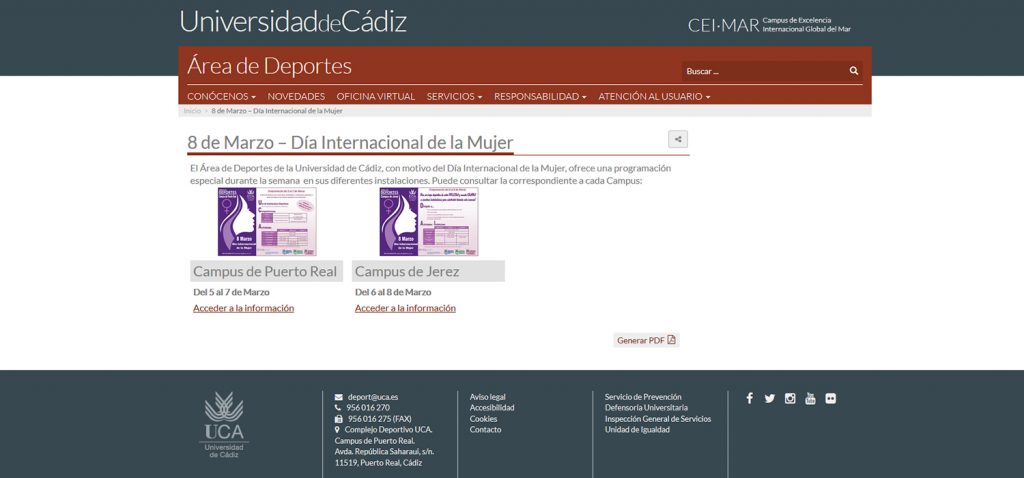 El área de Deportes de la Universidad de Cádiz, con motivo del Día Internacional de la Mujer, ofrece una programación especial durante la semana en sus diferentes instalaciones. Con la tarjeta deportiva UCA se podrá participar de manera gratuita, previa reserva y según plazas disponibles en los campus de Puerto Real (del 5 al 7 de marzo) y Jerez (del 6 al 8 de marzo).