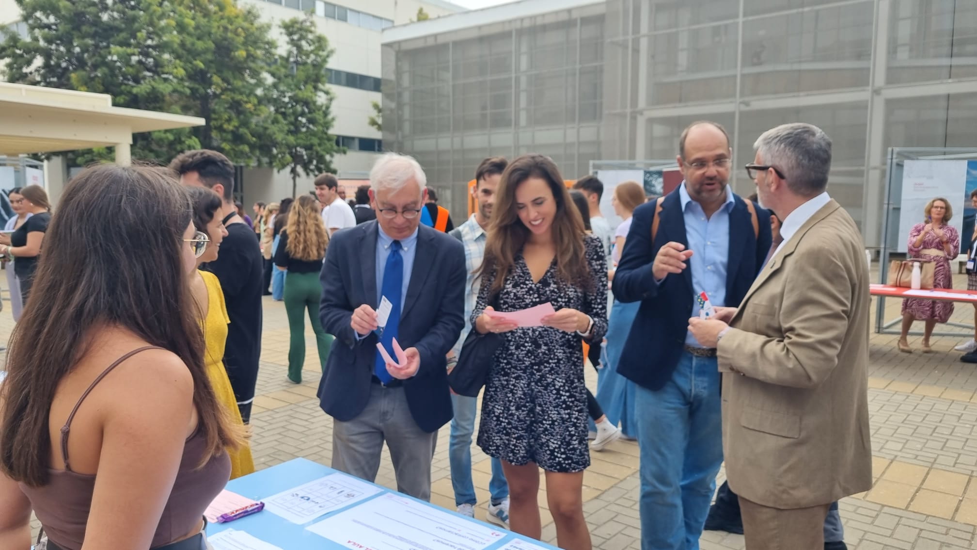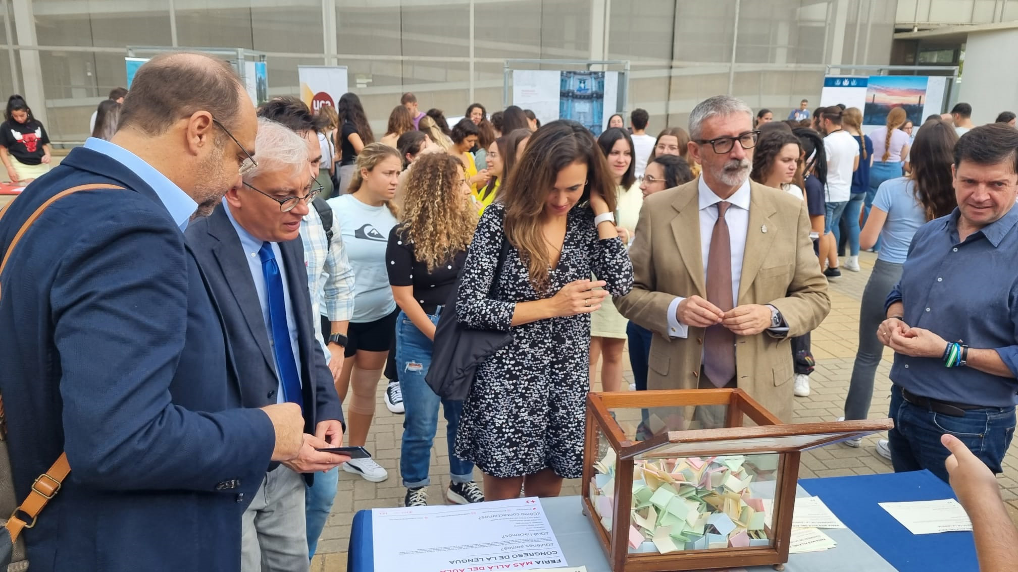 El Campus de Jerez de la Universidad de Cádiz celebra hoy, de 9,45 horas a 18 horas, la II Feria Más allá del aula. Un encuentro que tiene como objetivo informar sobre todas las actividades que se realizan en este espacio universitario, con la idea de crear comunidad y ampliar la vida universitaria. El rector de la Universidad de Cádiz, Francisco Piniella, en compañía del decano de Ciencias Sociales de la Comunicación, José Antonio López, el vicedecano de Proyección y Recursos de la Facultad de Derecho, Antonio Díaz, y el delegado de Reactivación Económica, captación de Inversiones, Educación y Empleo del Ayuntamiento de Jerez, Juan Antonio Cabello, han realizado una visita a los 20 stands que se ubican en el patio del aulario, donde alumnado, asociaciones y los diferentes servicios y áreas presentan sus propuestas.