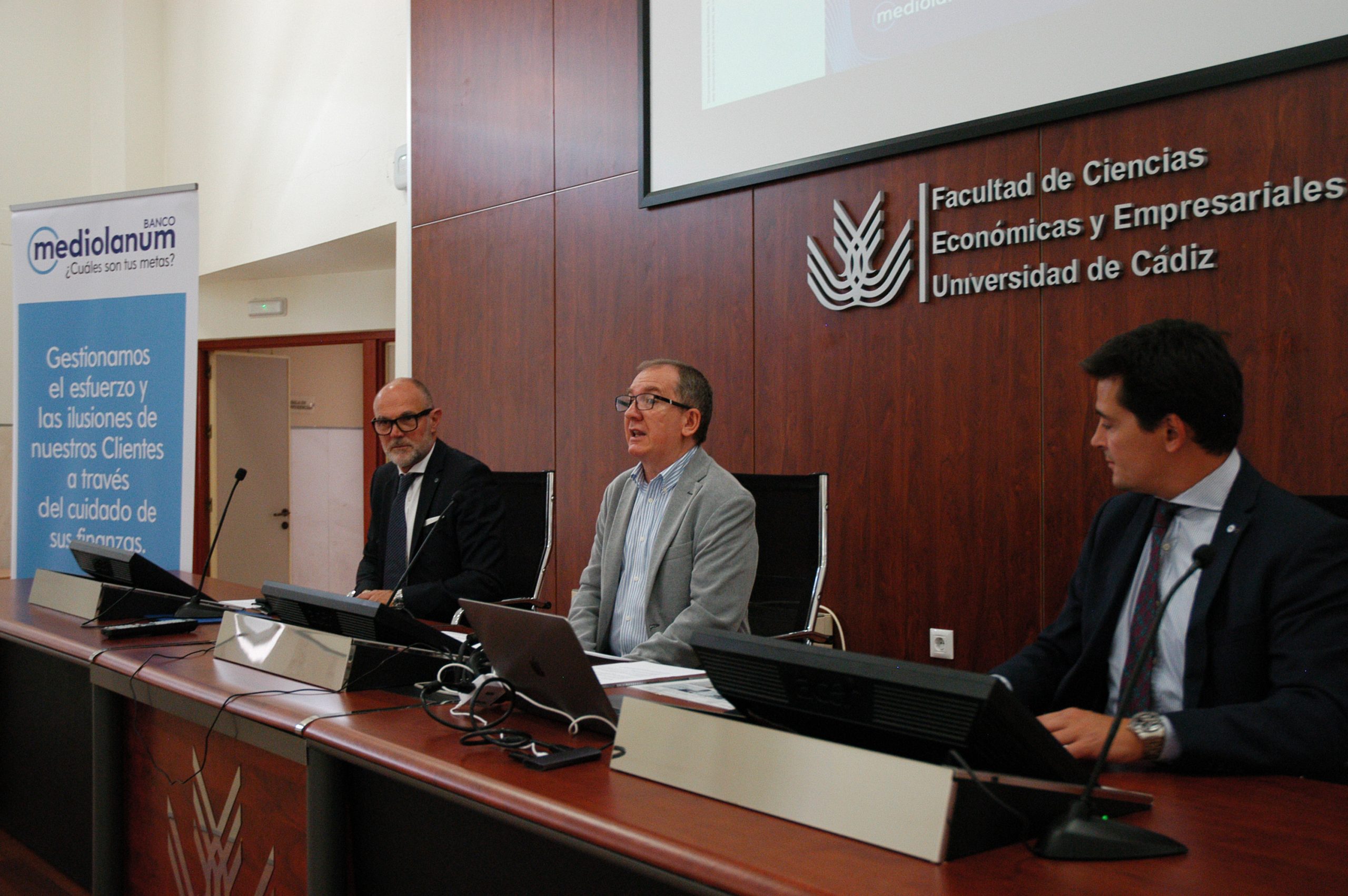 El responsable de Asset Allocation & Corporate Advisory en Banco Mediolanum, Mario Rappanello, y el Family Banker Group Manager con Banco Mediolanum en Andalucía, Baldomero García, son los ponentes invitados para dar a conocer nuevas vías para el autoempleo y negocios emergentes. Les ha acompañado el decano de la Facultad, Pedro Araujo.