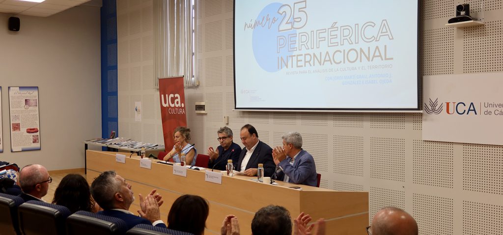 La Universidad de Cádiz ha celebrado la presentación del número 25 de Periférica Internacional. Revista para el análisis de la cultura y el territorio, en un acto institucional que ha tenido lugar a las 19:00 horas en la Sala Argüelles del Edificio Constitución 1812. Presidido por el rector de la UCA, Casimiro Mantell, el encuentro ha contado con la participación del secretario de Estado de Cultura, Jordi Martí Grau, que ha estado acompañado por el director de la revista, Antonio Javier González Rueda, y por Isabel Ojeda, miembro del Consejo Editorial y directora de Cultura de la Universidad Internacional de Andalucía (UNIA).