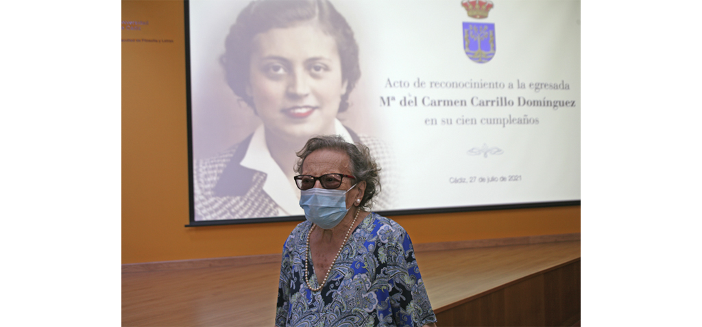 Mª Carmen Carrillo Domínguez hoy cumple 100 años. Fue pionera al cursar estudios superiores en la Escuela Profesional de Comercio de Cádiz en los años 30 del siglo XX. La Universidad de Cádiz le ha organizado un acto de reconocimiento como egresada de Honor, que ha presidido el rector de la UCA, Francisco Piniella, junto a la delegada del Rector para las Políticas de Igualdad y de Inclusión de la UCA, Maika García, el vicerrector de Estudiantes y Empleo, Manuel Sánchez, el decano de la Facultad de Ciencias Económicas y Empresariales, Pedro Araújo, así como familiares y miembros de la comunidad universitaria.