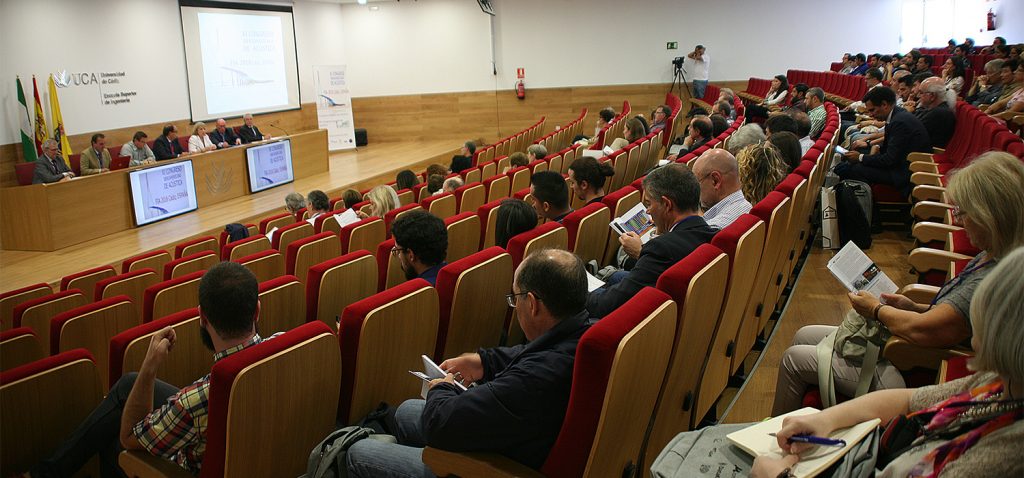 El director de secretariado de Proyectos Internacionales de la Universidad de Cádiz, Francisco Javier Pacheco, la presidenta de la Federación Iberoamericana de Acústica (FIA), Nilda Vechiatti, el director de la ESI, Juan José Domínguez, el secretario General de la FIA y coordinador del Comité Organizador, el profesor de la UCA, Ricardo Hernández, el presidente y secretario general de la Sociedad Española de Acústica, Antonio Pérez y Antonio Calvo-Manzano, respectivamente, y el presidente de la Sociedad Portuguesa de Acústica, Jorge Patricio, les han dado la bienvenida en el salón de Actos de la Escuela.