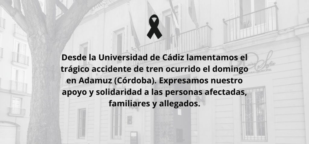 La Universidad de Cádiz convoca a toda la comunidad universitaria mañana martes, 20 de enero, a un minuto de silencio en memoria de las víctimas del accidente ferroviario ocurrido en Adamuz (Córdoba) el pasado domingo. El acto, en señal de duelo por las víctimas y en solidaridad con las familias afectadas y las personas allegadas, se llevará a cabo a las 12.00 horas en las puertas de todos los centros.
