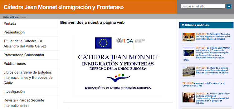 La Comisión Europea ha concedido para el periodo 2017-2020 el Centro de Excelencia Jean Monnet Center of Excellence Inmigración y derechos humanos en las fronteras exteriores europeas – Migration and human rights in europe´s external borders al área de Derecho Internacional Público y Relaciones Internacionales de la Universidad de Cádiz, que dirigirá el catedrático de la Universidad de Cádiz, Alejandro del Valle Gálvez. Se trata de uno de los 15 Centros de Excelencia concedidos por la Unión Europea, que situará a la Universidad de Cádiz en los ámbitos de Migraciones, Fronteras y Derechos Humanos como centro de referencia internacional y europeo.