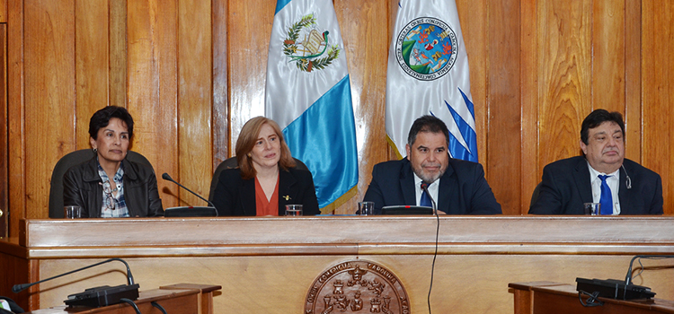 El rector de la Universidad de San Carlos, Carlos Alvarado Cerezo, dio la bienvenida a las representantes de la UCA: la secretaria general, Francisca Fuentes Rodríguez, la directora de la Unidad de Igualdad, Mª Luisa de la Flor Fernández, la magistrada de la sala de lo Penal de la Audiencia Nacional, Ana Rubio Encinas, y a la coordinadora del proyecto, Esther Gil de Reboleño Lastortres.