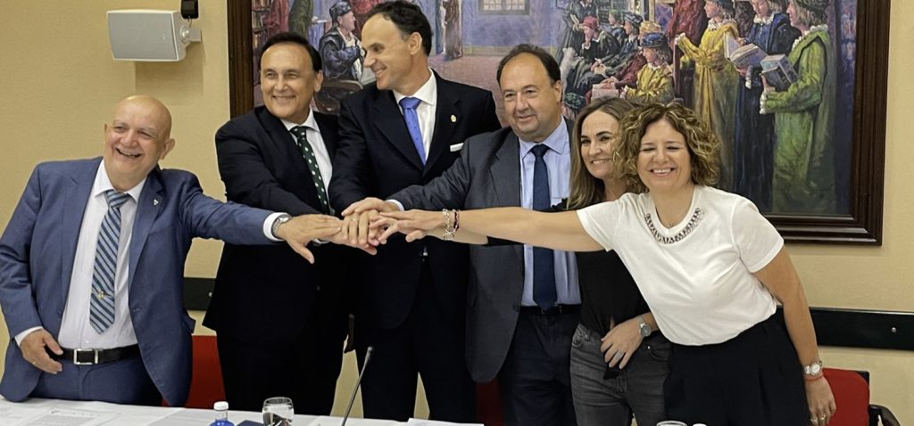 El consejero de Universidad, Innovación e Investigación de la Junta de Andalucía, Juan Carlos Gómez, el rector de la Universidad de Cádiz, Casimiro Mantell, y el alcalde de Lebrija, José Benito, han firmado hoy, junto a la vicerrectora de Igualdad y Política Social de la Universidad de Málaga, María José Berlanga, y la vicerrectora de Política Científica de la Universidad de Córdoba, María José Polo, el protocolo general de creación del Centro de Investigación Interuniversitario de Andalucía “Elio Antonio de Nebrija. Humanismo y Tradición Clásica” (EAN).