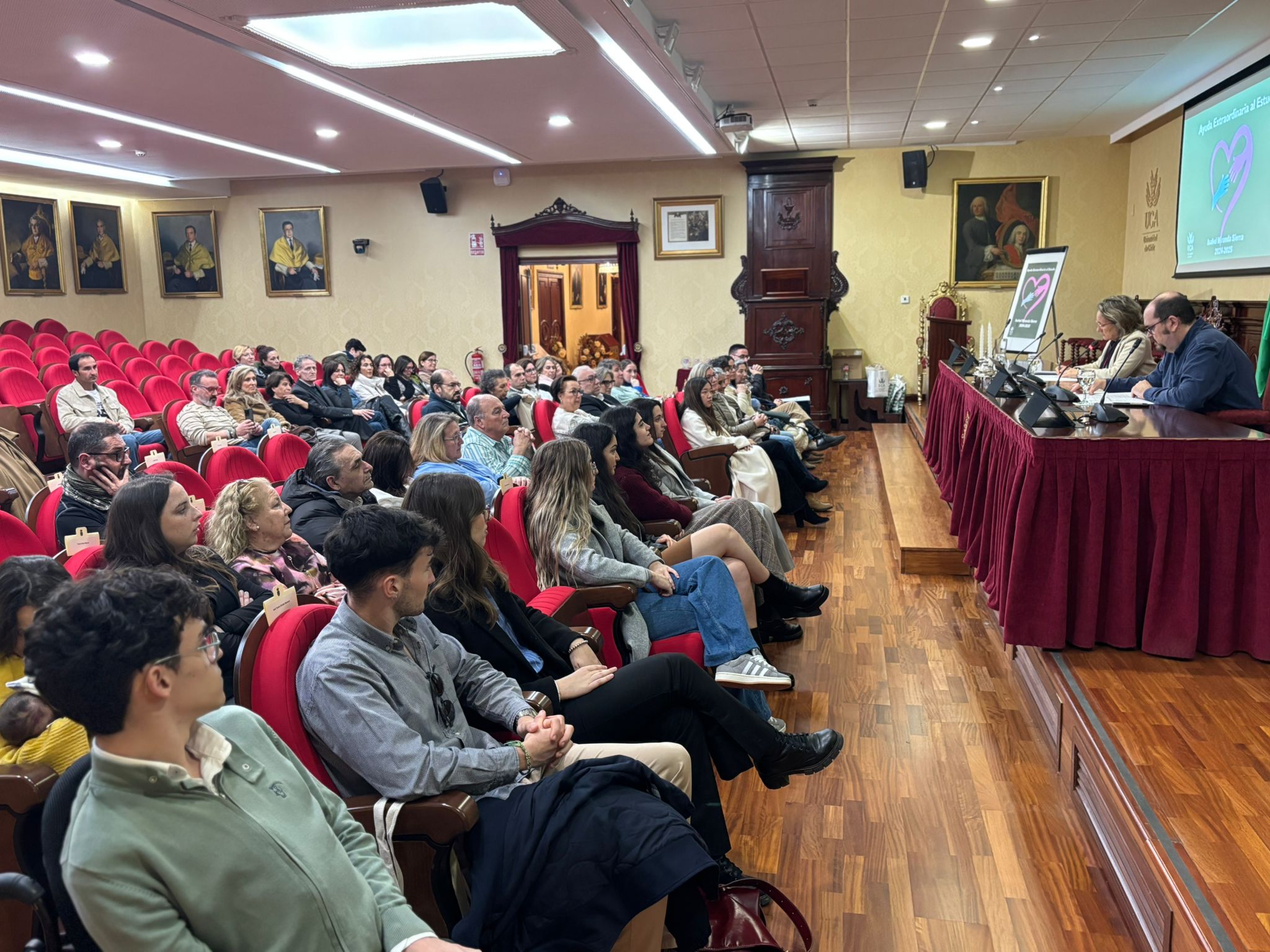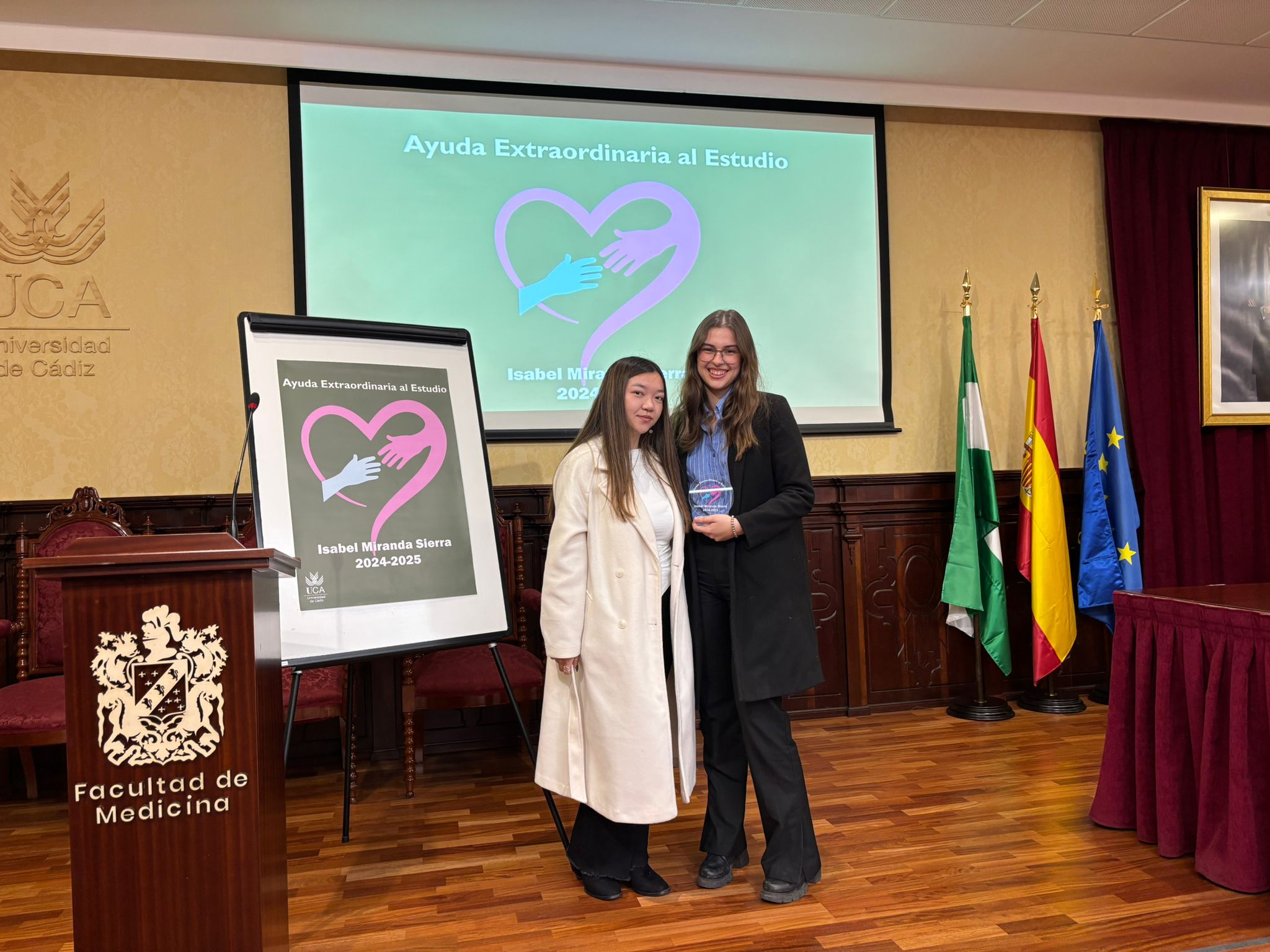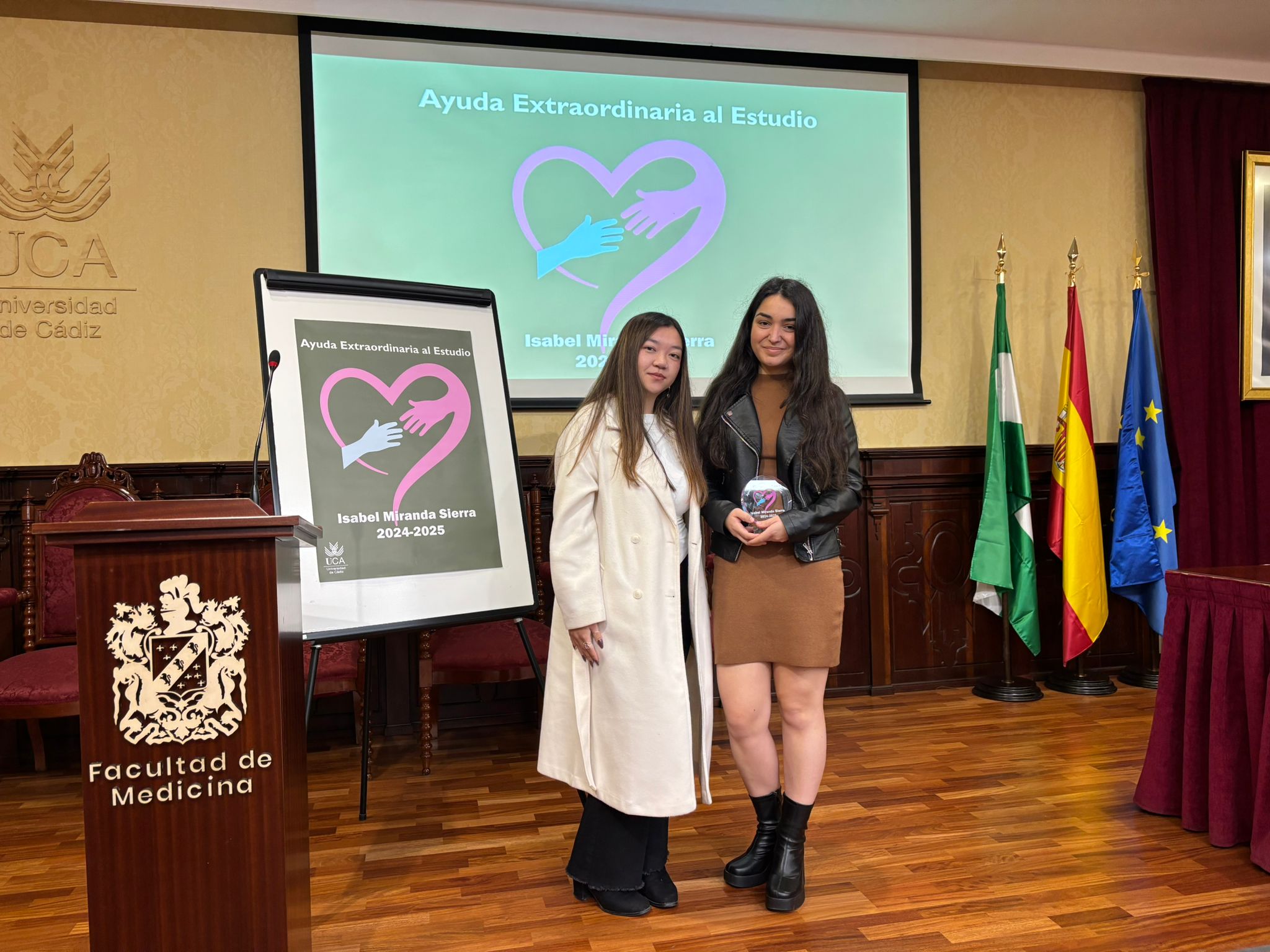 La vicerrectora de Estudiantes de la Universidad de Cádiz, Nuria Campos, junto al jefe de sección del área de Atención al Alumnado (Becas), Manuel Molina, ha presentado el acto de entrega de las Ayudas Extraordinarias al Estudio Isabel Miranda Sierra, que se ha celebrado en el salón de Actos de la Facultad de Medicina.