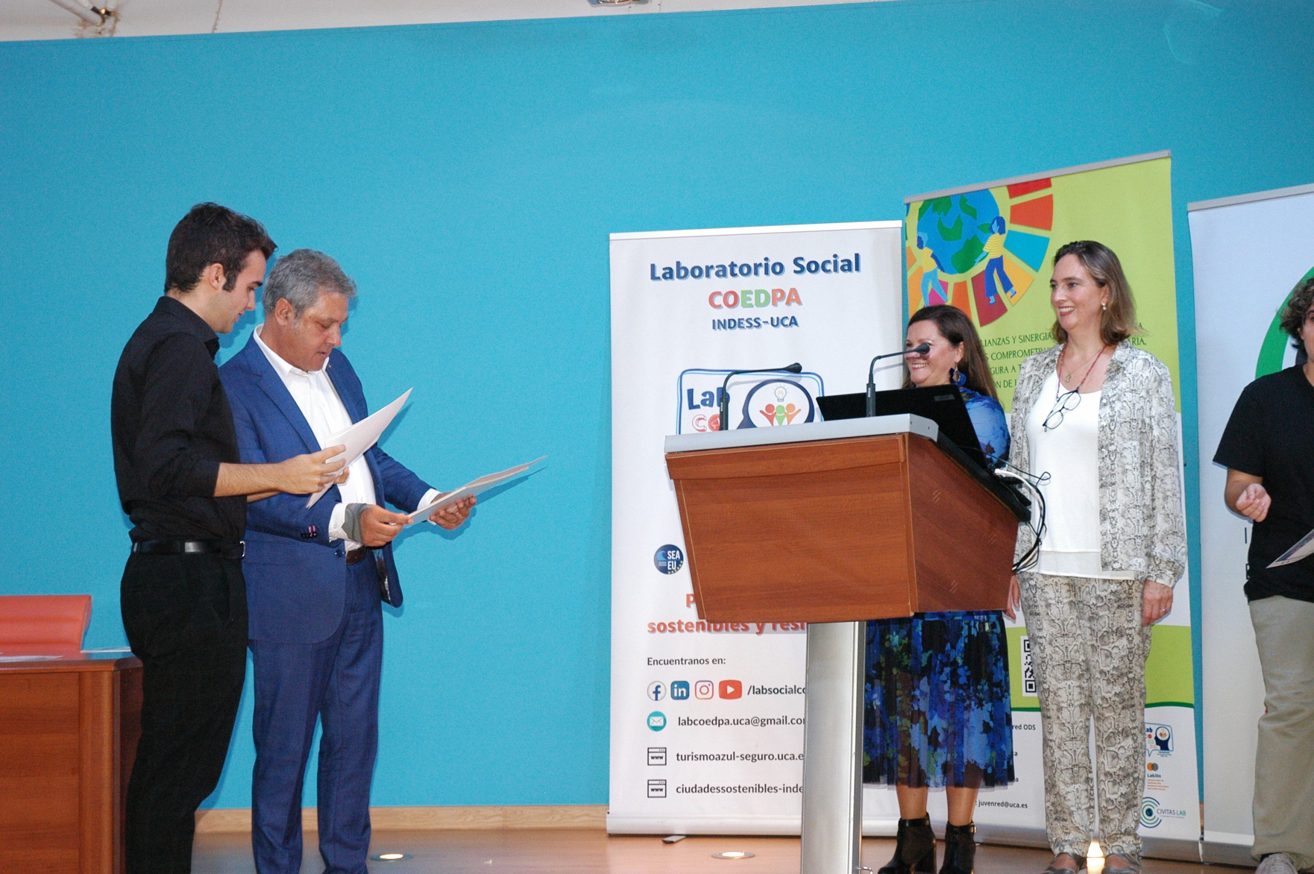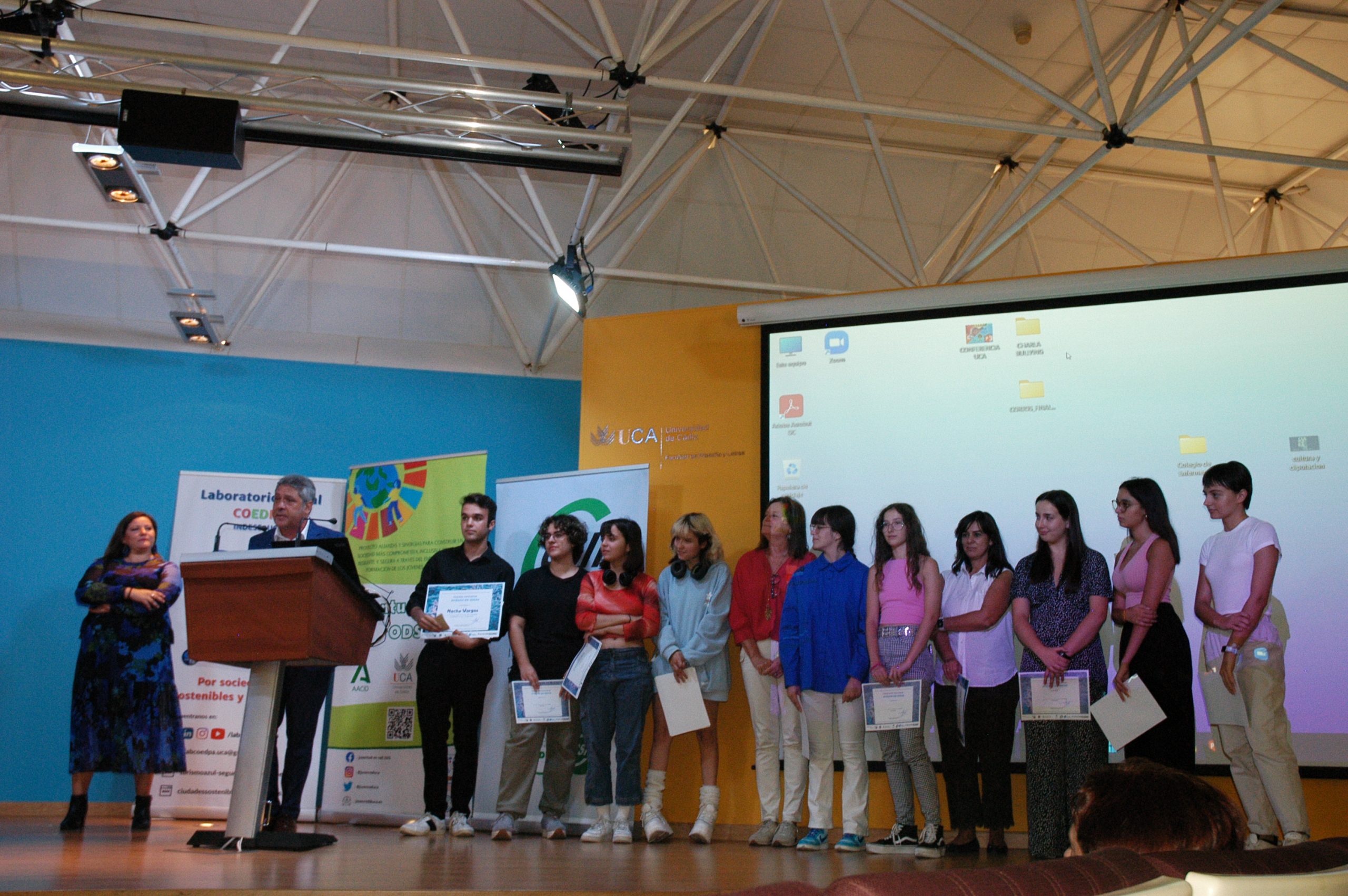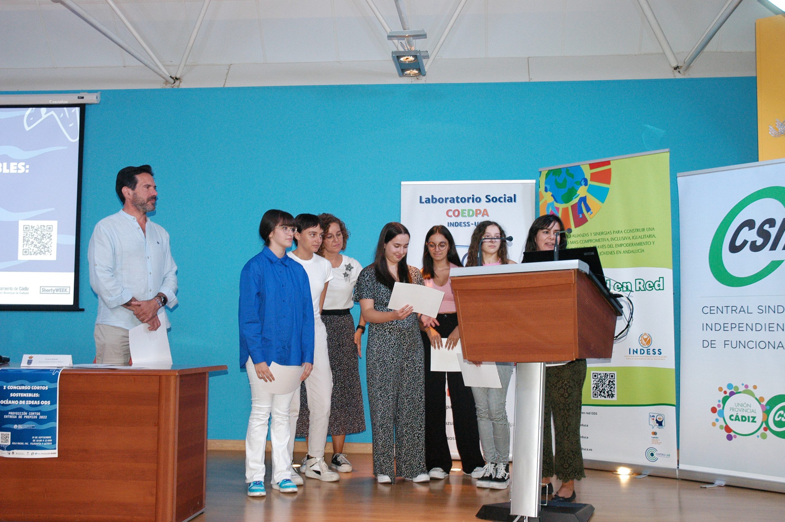 Tras la proyección de las 12 obras finalistas (se adjunta listado), se ha hecho entrega de los galardones. En primer lugar, en la sección Centro educativo al IES Cornelio Balbo (Cádiz) por su corto Pequeñas acciones para preservar la biodiversidad, ha recibido un premio – aportado por CSIF Cádiz – por valor de 1.000 euros, en la de Juventud sostenible al corto Vita de Nacho Vargas (El Puerto de Santa María), dotado con 500 euros patrocinados por la Fundación del Cádiz Club de Fútbol, en la categoría Comunidad Universitaria ganó La Historia de una neonatóloga de Gonzalo Vadillo (Puerto Real), que obtuvo 600 euros de la Oficina de Cooperación Internacional de la UCA, y; por último, en la sección nacional Océano ODS, dotada con 1.000 euros en material audiovisual con el soporte de Aguas de Cádiz, se reconoce el corto Aiko – Me encanta el mar de César Déneken (Jerez de la Frontera).