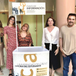 Foto 1: Punto de Información de la Oficina del Estudiante en el CASEM. De izquierda a derecha: Mercedes Zájara, administradora del Campus de Puerto Real, Ana Mª Ramos, becaria de la Oficina del Estudiante-, Zaira Rivero, becaria del Punto de Información de la Oficina del Estudiante en el CASEM, Mª Victoria Redondo, decana de la Escuela de Ingeniería Naval y Oceánica y coordinadora del CASEM, y Fernando Sánchez, director de la Oficina del Estudiante.