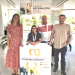 Foto 3: Punto de Información de la Oficina del Estudiante en la ESI. De izquierda a derecha: Ana Mª Ramos, becaria de la Oficina del Estudiante, Sandra Rueda, becaria del Punto de Información de la Oficina del Estudiante en la ESI, Alejandro Pérez, subdirector de Estudiantes y Títulos de la ESI, y Fernando Sánchez, director de la Oficina del Estudiante.