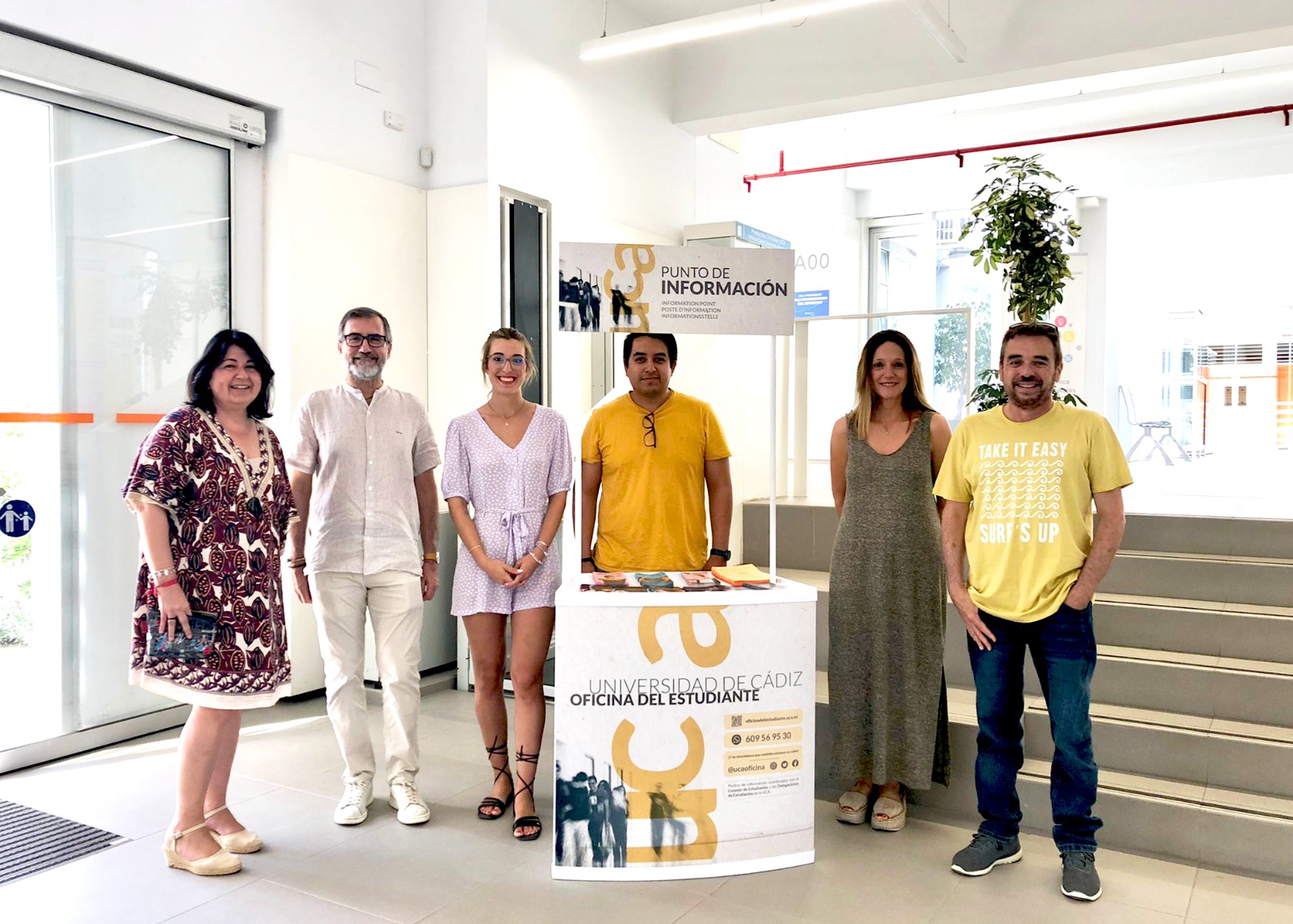 Foto 4: Punto de Información de la Oficina del Estudiante en la ETSIA. De izquierda a derecha: Marusa Arias, directora de secretariado del Campus Bahía de Algeciras, Manuel Sánchez, vicerrector de Estudiantes y Empleo, Ana Mª Ramos, becaria de la Oficina del Estudiante, Mario Alberto Ramírez, becario del Punto de Información de la Oficina del Estudiante en la ETSIA, Mª del Mar Cerbán, vicerrectora del Campus Bahía de Algeciras, y Fernando Sánchez, director de la Oficina del Estudiante.