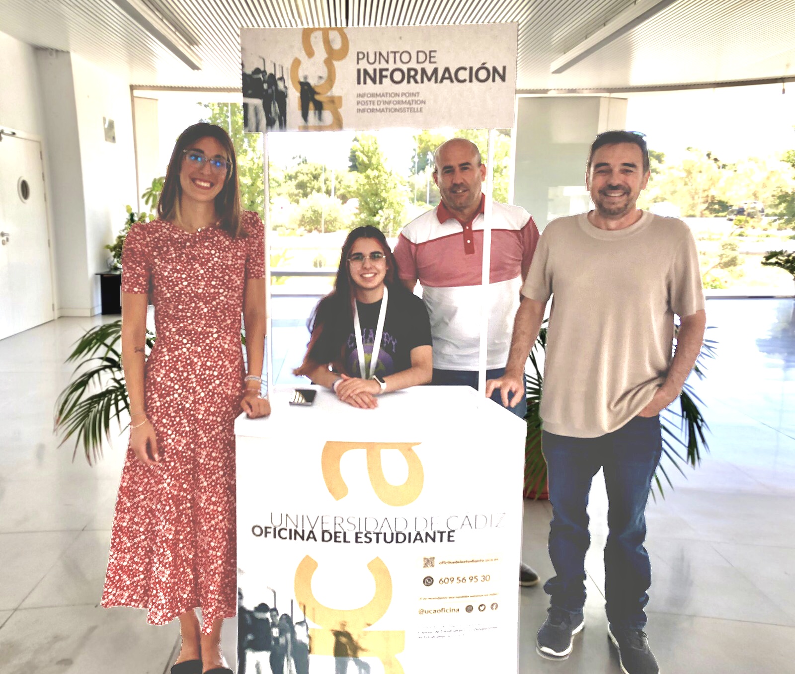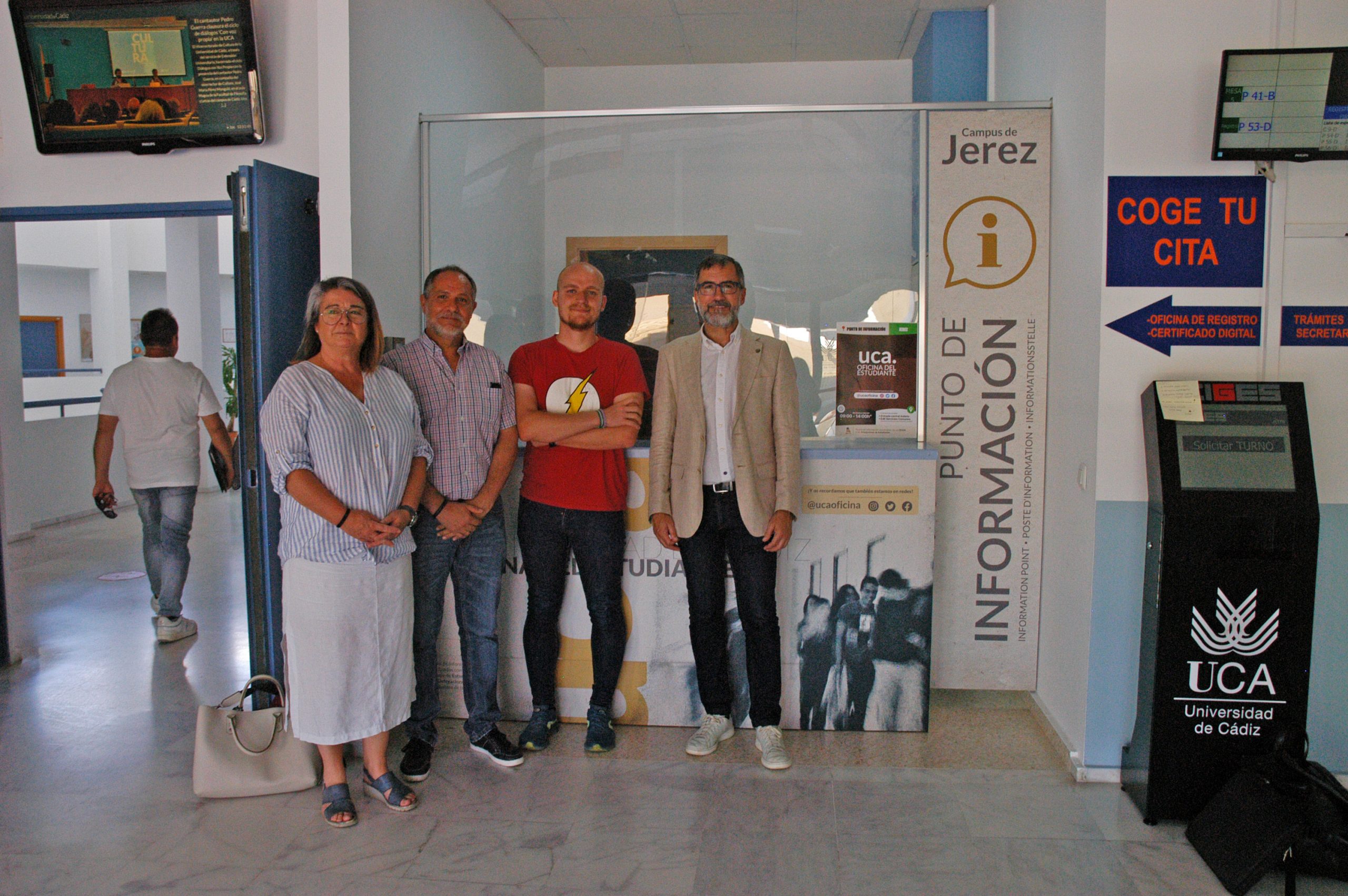 Foto 2: Punto de Información de la Oficina del Estudiante en el Campus de Jerez. De izquierda a derecha: Carolina Martín, directora de secretariado de Alumnado, Antonio Rafael Peña, delegado del Rector para el Campus de Jerez, Joaquín Collado, becario del Punto de Información de la Oficina del Estudiante en Jerez, y Manuel Sánchez, vicerrector de Estudiantes y Empleo de la UCA.