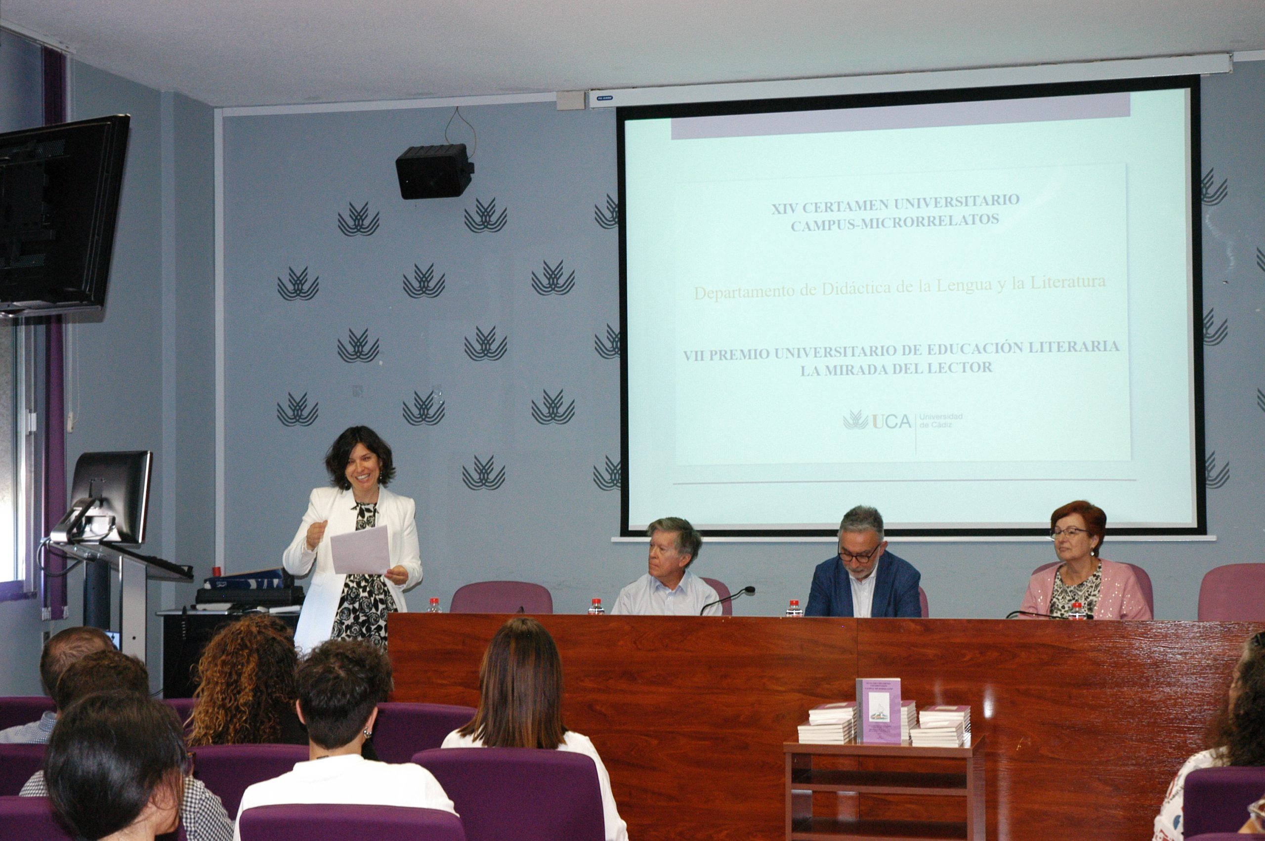 La sala de Conferencias Alicia Plaza de la Facultad de Ciencias de la Educación ha acogido la clausura del XIV Certamen Universitario Campus-Microrrelatos y del VII Premio Universitario de Educación Literaria La Mirada del Lector, organizados por el departamento de Didáctica de la Lengua y la Literatura de la Universidad de Cádiz. El acto contó con la presidencia del coordinador de la Red Internacional de Universidades Lectoras (RIUL) y director del departamento de Didáctica de la Lengua y la Literatura, Manuel Romero. La coordinadora de los certámenes, Ester Trigo Ibáñez, profesora del departamento de Didáctica de la Lengua y la Literatura, ha presentado las diversas actividades y leyó los fallos de los jurados. La decana de la Facultad de Ciencias de la Educación, Lourdes Sánchez, intervino al final del acto.