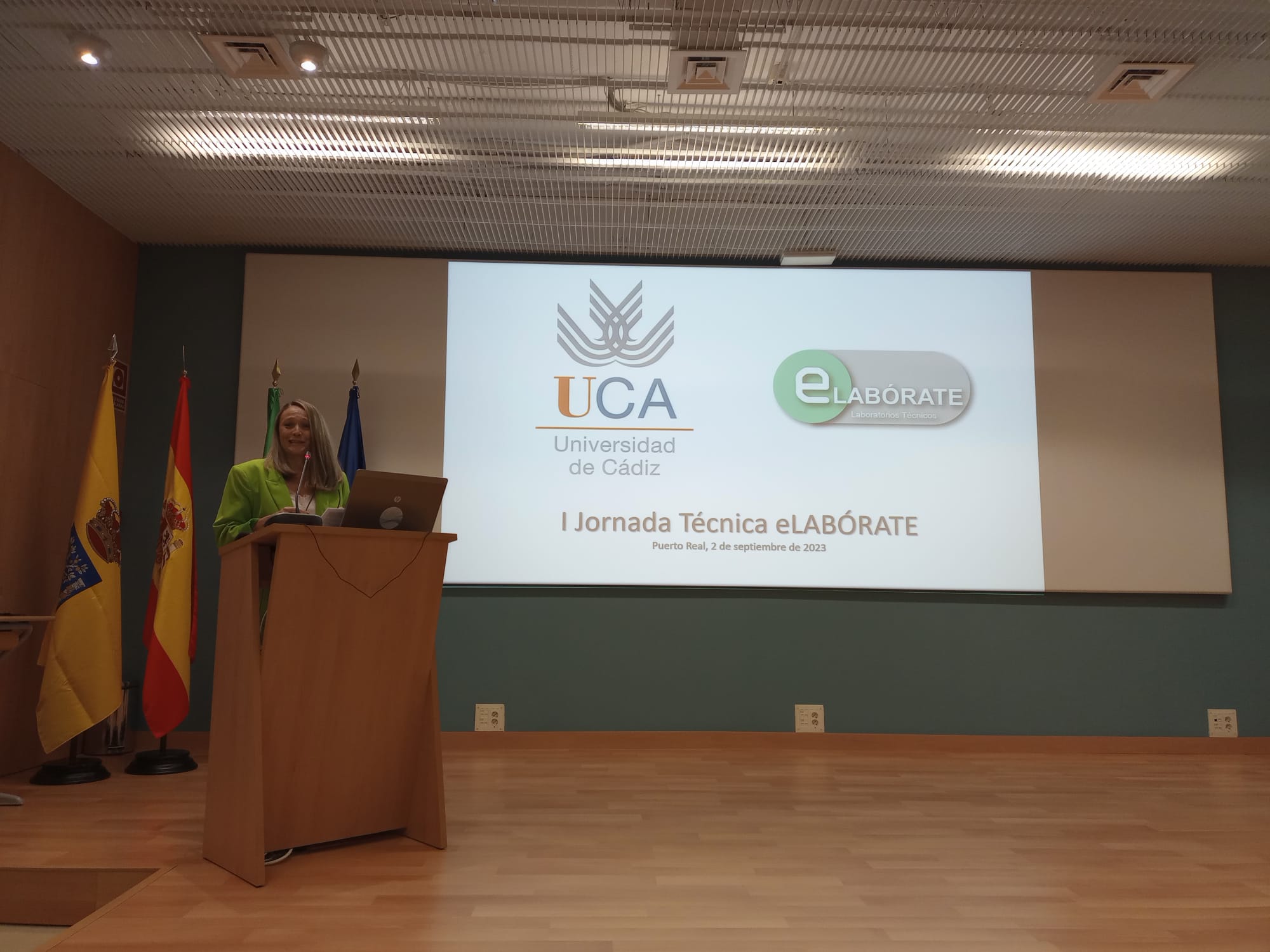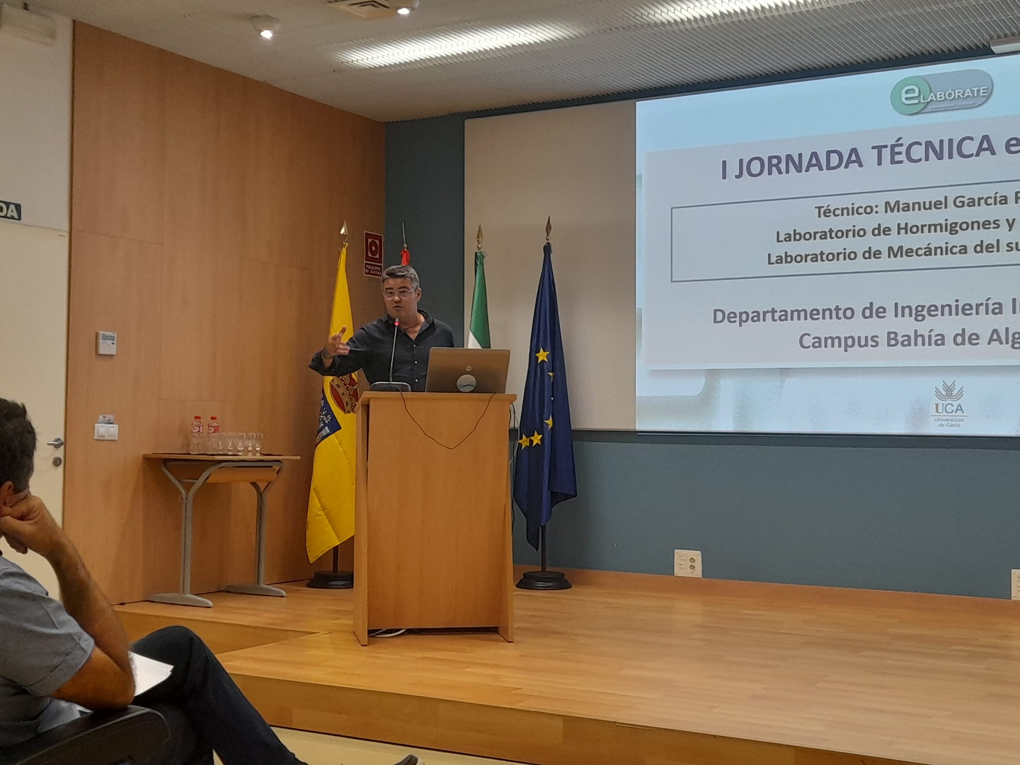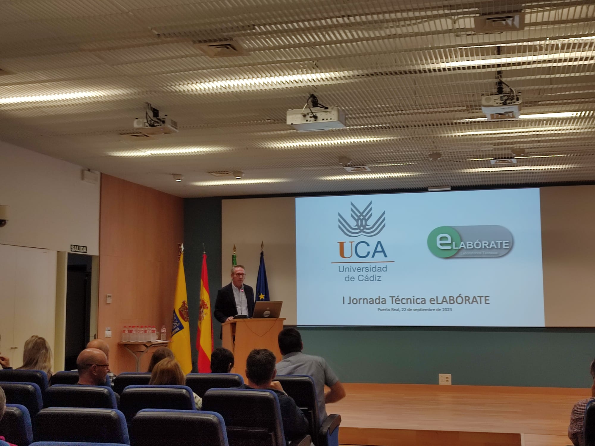 La jefa del servicio de Gestión de la Calidad de la UCA, Juana Álvarez, ha pronunciado la primera ponencia sobre Gestión de la calidad: Laboratorios, seguida de Carlos Gómez Luy, del servicio de Prevención, que ha tratado de Seguridad y salud en laboratorios y talleres (aspectos ergonómicos, higiénicos y de seguridad). La segunda parte del programa se ha dedicado a la intervención de los técnicos de eLABÓRATE de los distintos tipos de laboratorios, presentados por el coordinador del grupo.