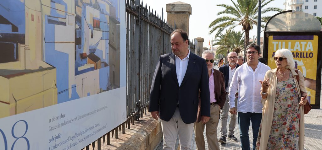 La reja del muelle de Cádiz acogerá, hasta el próximo 23 de septiembre, la muestra Mirando a Cádiz en perspectiva: 75 años de Cursos de Verano, que ha sido inaugurada de manera oficial este miércoles. El acto ha contado con la presencia del rector de la Universidad de Cádiz, Casimiro Mantell, que ha estado acompañado por la presidenta de la Autoridad Portuaria de la Bahía de Cádiz, Teófila Martínez; por el vicerrector de Sostenibilidad y Cultura, Gonzalo Sánchez; y por los autores de los textos e imágenes de la muestra, el catedrático emérito Alberto Ramos y el artista Cecilio Chaves.