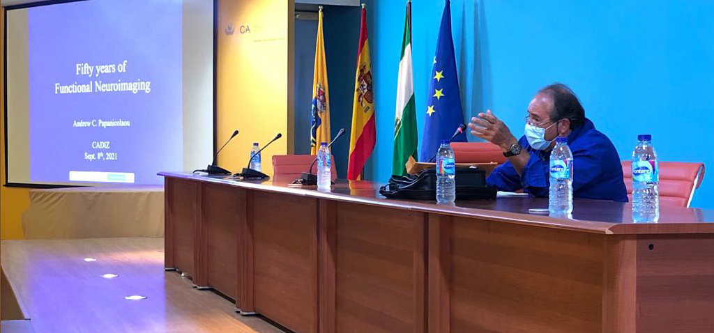 La vicerrectora de Política Científica y Tecnológica de la UCA, Mª Jesús Mosquera, ha presidido el acto inaugural junto a la concejala de Comercio y Turismo del Ayuntamiento de Cádiz, Montemayor Mures, los coordinadores nacional y local del Congreso, Paula Pazo y Javier González (investigador Ramón y Cajal de la UCA), y el director General de Recursos Científicos de la UCA, Félix Ruiz, en el aula Magna de la Facultad de Filosofía y Letras. A continuación, el profesor Andrew C. Papanicolaou, de la Universidad de Tennessee en Estados Unidos (Health Science Center), ha impartido la primera conferencia plenaria sobre 50 años de neuroimagen funcional.
