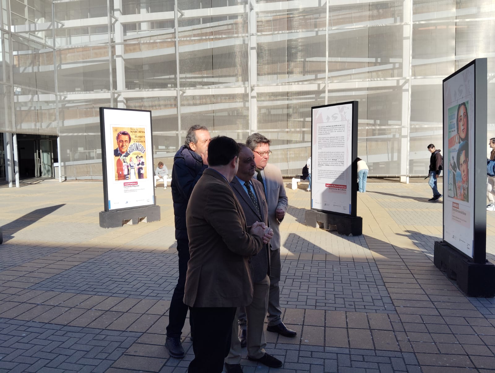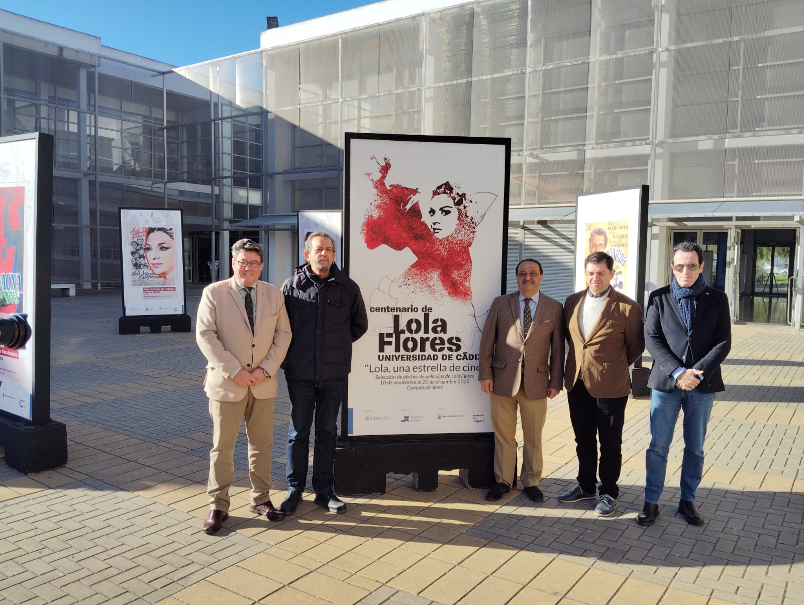 El vicerrector en funciones de Cultura de la Universidad de Cádiz, Jacinto Porro, junto al decano de la Facultad de Ciencias Sociales y de la Comunicación, José Antonio López, los delegados de Cultura y de Desarrollo Educativo, Formación Profesional, Universidades y Deportes del Ayuntamiento de Jerez, Francisco Zurita y José Ángel Aparicio, y el coordinador del máster interuniversitario Investigación y Análisis del Flamenco, Francisco Perujo, ha inaugurado esta mañana en el patio del Aulario del Campus de Jerez la exposición organizada por la UCA en el Centenario de Lola Flores y que, bajo el título de ‘Una estrella de cine, recoge una veintena de afiches seleccionados entre la extensa cinematografía de la artista jerezana con más de 40 títulos protagonizados en la gran pantalla desde su debut en 1940 con Martingala hasta su última aparición en Coraje de vivir (1993).