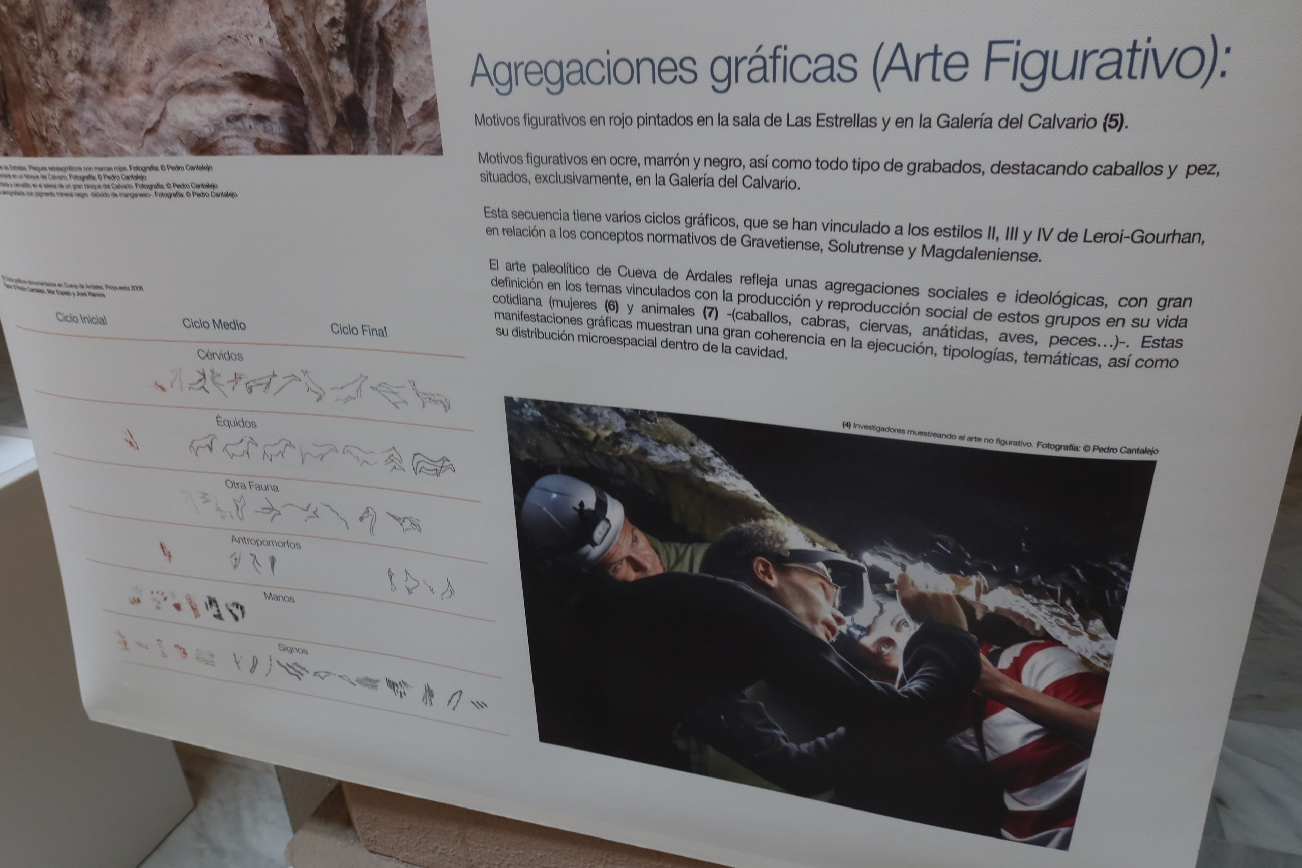 La exposición recoge en ocho paneles una síntesis de la investigación desarrollada en las dos cavidades. “Se indican datos de la localización geográfica y geológica, de la gran variedad de recursos disponibles por las sociedades prehistóricas en el territorio inmediato y de la historia de las investigaciones. Se da un balance paleoecológico de las secuencias estratigráfícas del Pleistoceno y Holoceno. Se presenta el registro arqueológico y de las analíticas científicas desarrolladas: Arqueología prehistórica: tecnología lítica, estudios cerámicos, Geoarqueología y Arqueometría, Arqueobotánica, Paleontología y fauna, Antropología humana, Antropología dental, Sistemas de dataciones -más de 100 dataciones obtenidas por: C14, OSL, TL, U/Th- para la obtención de unos resultados históricos que explican los modos de vida de las sociedades cazadoras-recolectoras del Paleolítico y de las sociedades tribales del Neolítico, en el territorio inmediato a dichas cuevas, en el entorno de la región geohistórica atlántica-mediterránea del Estrecho de Gibraltar”, en palabras del profesor Ramos.