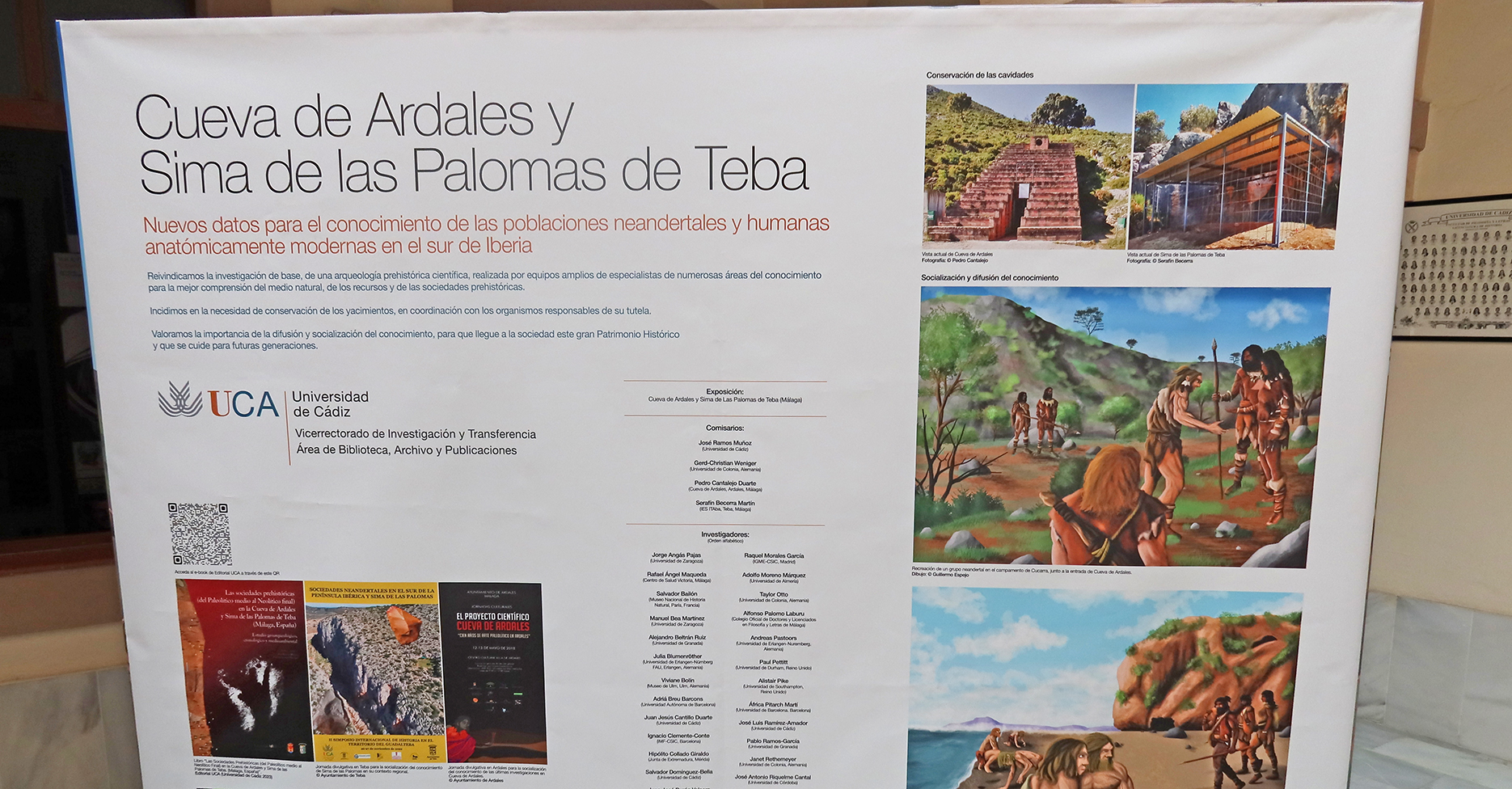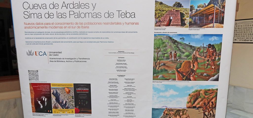 La Universidad de Cádiz, en el marco de la programación de la Semana Universitaria del Libro 2024, ha inaugurado – en el patio derecho de la Biblioteca de Humanidades de la Facultad de Filosofía y Letras – la exposición ‘Cueva de Ardales y Sima de las Palomas de Teba. Nuevos datos para el conocimiento de las poblaciones neandertales y humanas anatómicamente modernas en el sur de Iberia’, impulsada por el Vicerrectorado de Investigación y Transferencia y comisariada por los profesores e investigadores de la Universidad de Cádiz, José Ramos Muñoz, Pedro Cantalejo Duarte y Serafín Becerra Martín y Gerd-Christian Weniger, por parte del Neanderthal Museum-Universidad de Colonia.