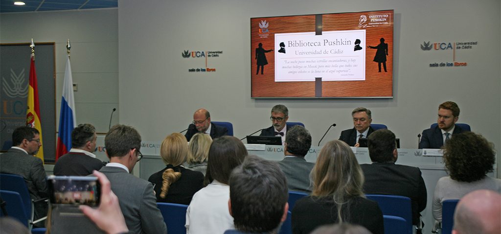 El rector de la Universidad de Cádiz, Francisco Piniella, en compañía del embajador de la Federación Rusa en España, Yuri P. Korchagin, han inaugurado, en el edificio Andrés Segovia y en compañía del vicerrector de Internacionalización de la UCA, Rafael Jiménez Castañeda, y del director del Centro Ruso de Ciencia y Cultura de Madrid, la primera biblioteca Pushkin en el ámbito hispano hablante del mundo, perteneciente al pionero centro nacional Instituto Pushkin ubicado en la Universidad de Cádiz, el equivalente ruso al Instituto Cervantes español. Dispone de más de 800 obras de recursos hispano-rusos al servicio de alumnado y comunidad universitaria.