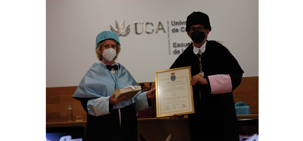 La Universidad de Cádiz ha celebrado hoy la investidura de doctoras Honoris Causa de Soledad Becerril y María Izquierdo, tal y como aprobó el Claustro Universitario en 2019. El rector de la UCA, Francisco Piniella, acompañado por la secretaria General de Universidades, Investigación y Tecnología de la Junta de Andalucía, Rosa Ríos, y la rectora de la Universidad de Granada, Pilar Aranda, ha presidido el acto solemne, en compañía de una representación del Claustro y de autoridades académicas, civiles y militares, en el salón de Actos de la Escuela Superior de Ingeniería del Campus de Puerto Real. La ceremonia, retransmitida en directo por videostreaming, ha tenido aforo limitado y se han guardado las medidas preventivas de seguridad y sanitarias por COVID-19.