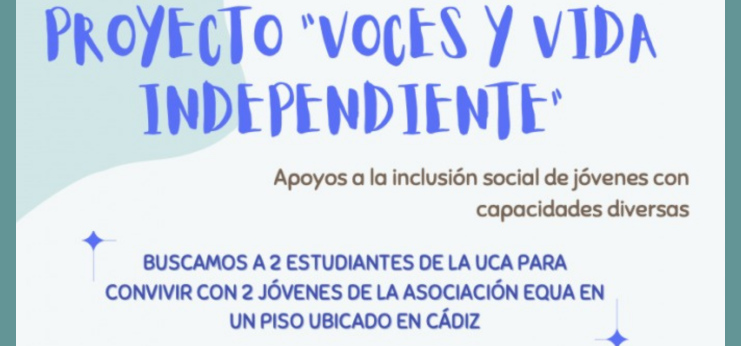 La Universidad de Cádiz, desde la Dirección General de Diversidad y el Vicerrectorado de Sostenibilidad y Cultura, junto a la asociación EQUA ofertan un año más el proyecto ‘Voces y Vida independiente’ destinado a apoyar la inclusión social de jóvenes con capacidades diversas. Se busca dos estudiantes de la UCA para convivir con dos jóvenes de la Asociación Equa del 25 de septiembre del 2024 al 31 de enero de 2025 en un piso ubicado en Cádiz. El periodo de inscripción finaliza el próximo 10 de septiembre.