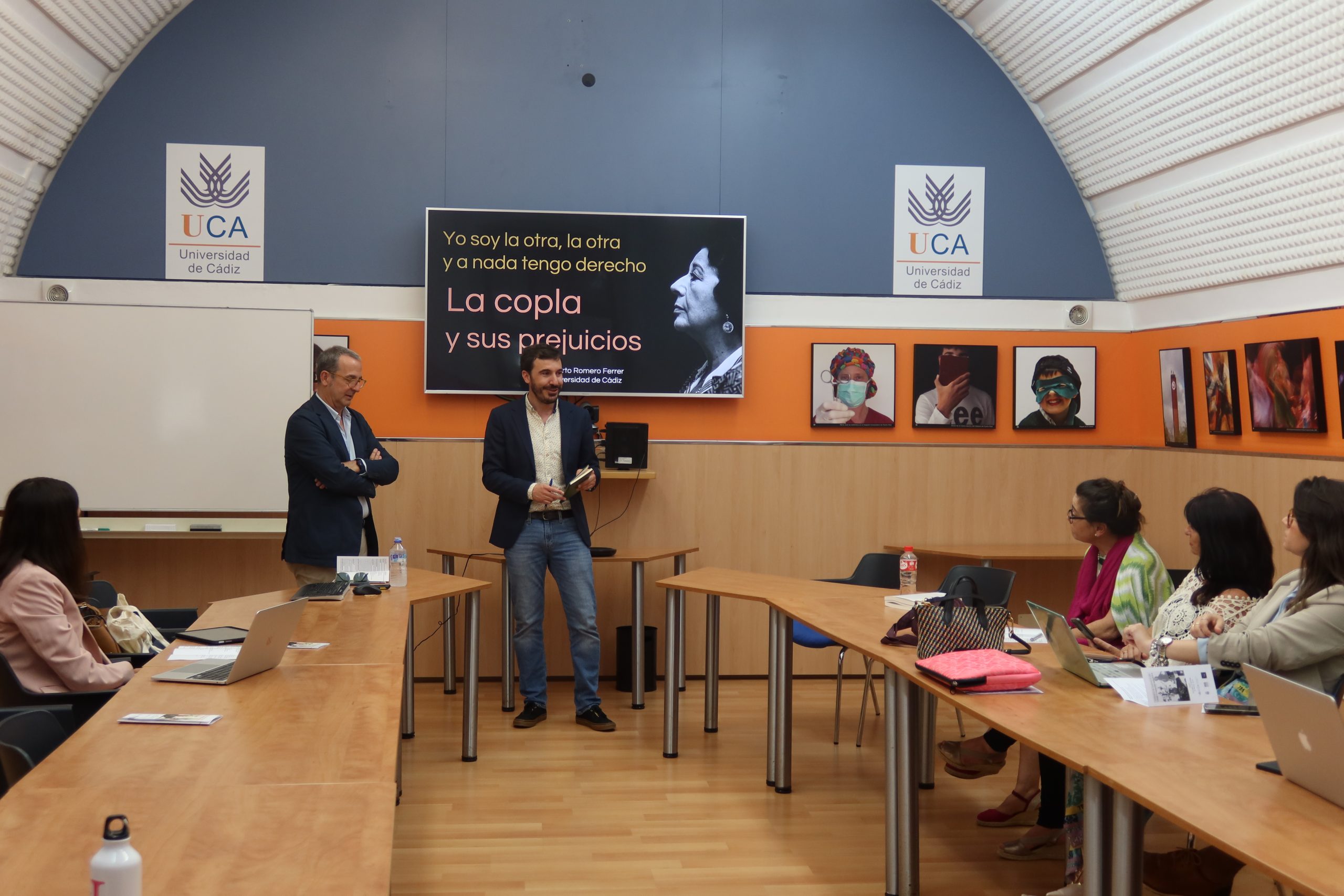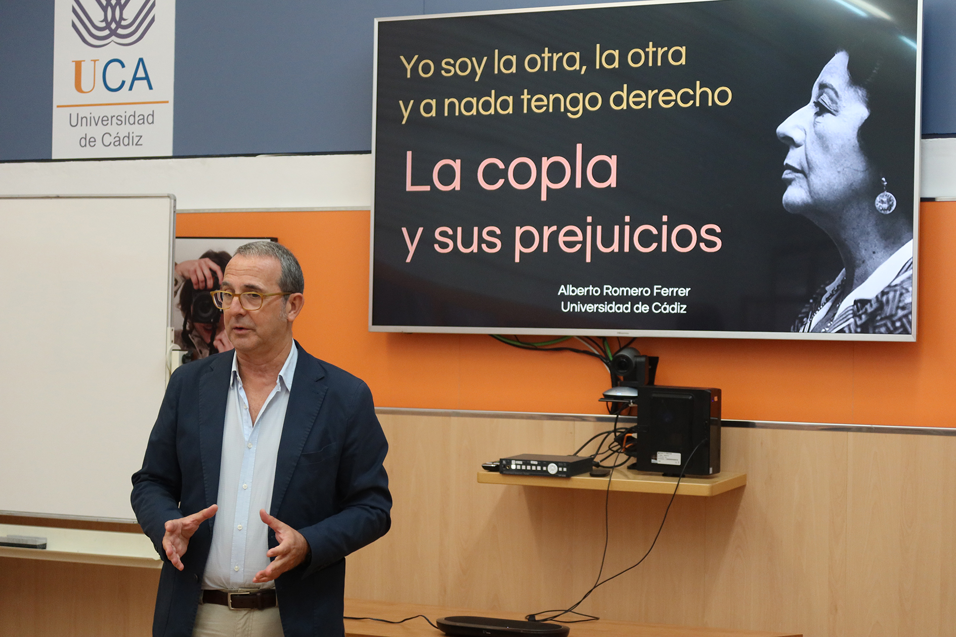 El catedrático de Filología de la UCA, Alberto Romero, presentado por el profesor Fernando Barrera, ha impartido la primera ponencia titulada “Yo soy la otra, la otra y a nada tengo derecho”: la copla y sus prejuicios. Ha planteado algunos interrogantes alrededor de la copla como género musical, literario, artístico, teatral de “calidad” frente a los prejuicios principalmente ha reseñado dos estigmas: el ideológico, que la relaciona “popular y especialmente dentro del ámbito académico, con el franquismo. Franco sí, comunismo no; igual a copla” y el cultural, que la sitúa en un lugar secundario como “algo periférico, que no tiene la calidad artística y forma parte del andalucismo de charanga y pandereta”.