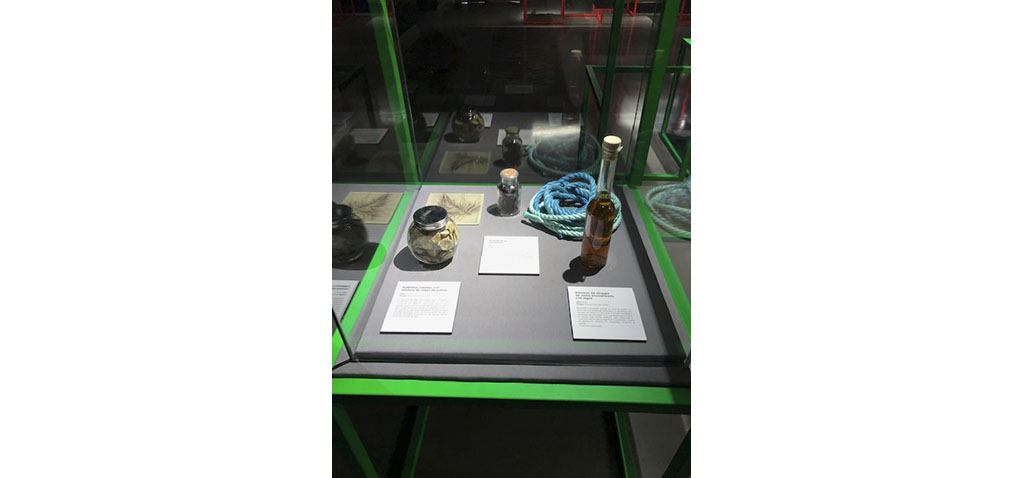 Para entender mejor esta investigación, se ha instalado en el MUNCYT, una vitrina donde puede verse un trozo de cuerda empleada en los cultivos de macroalgas, un bote de galletitas saladas con mixtura de algas de estero, una botella de aderezo de vinagre de Jerez aromatizado con algas y una muestra de la macroalga verde Ulva laminar (en bote).