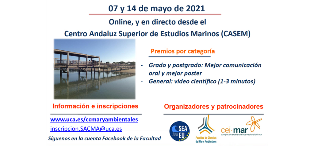 El Centro Superior Andaluz de Estudios Marinos (CASEM) del Campus de Puerto Real acogerá, del 7 y 14 de mayo, el VI Simposio Científico de Alumnos de la Facultad de Ciencias del Mar y Ambientales (SACMA). Esta edición contará con 22 comunicaciones orales y 23 pósteres, en los que el alumnado participante compartirá su investigación en el ámbito marino y ambiental. Como novedad de este año, y para adaptarse a la situación generada por la pandemia, el programa combinará actividades presenciales y actividades en línea.