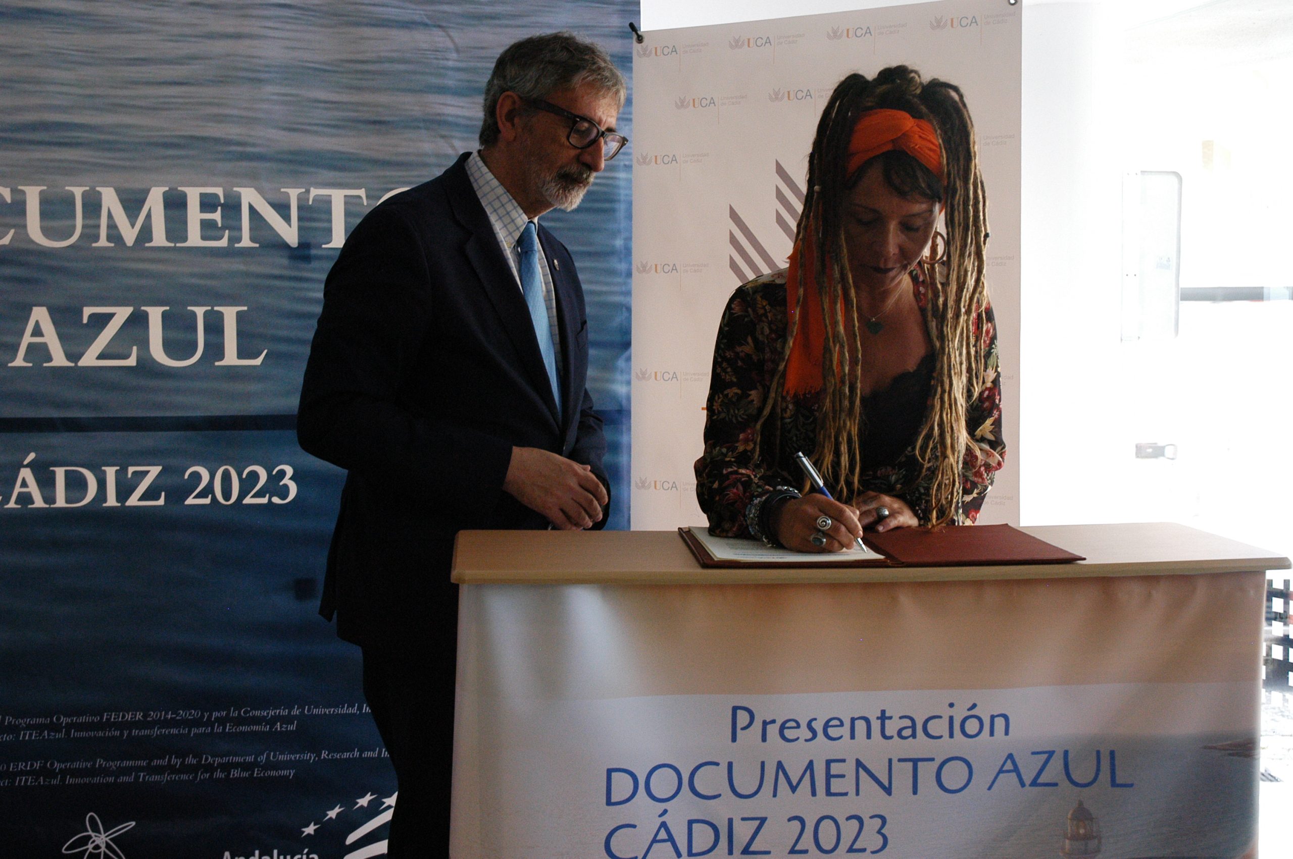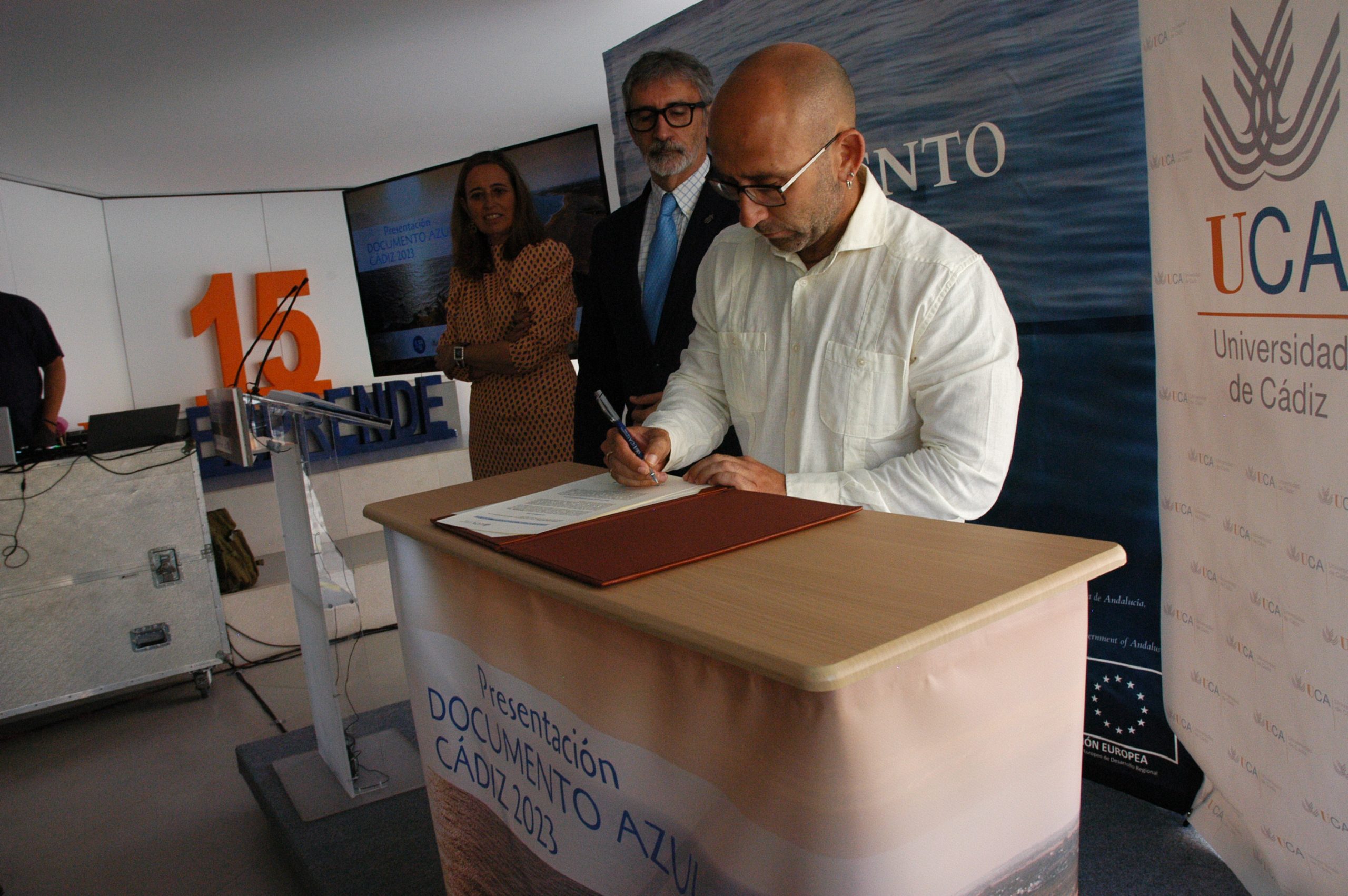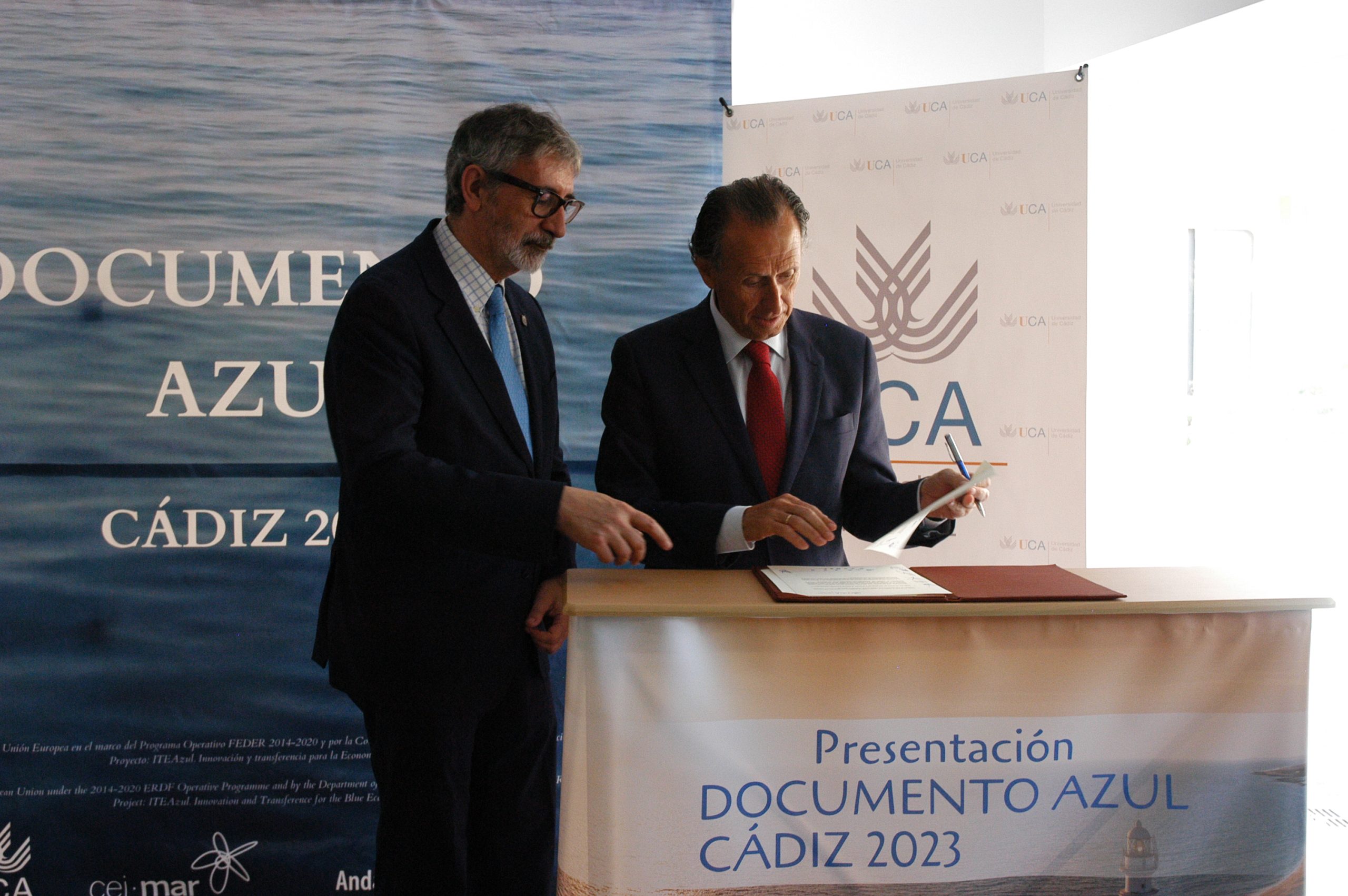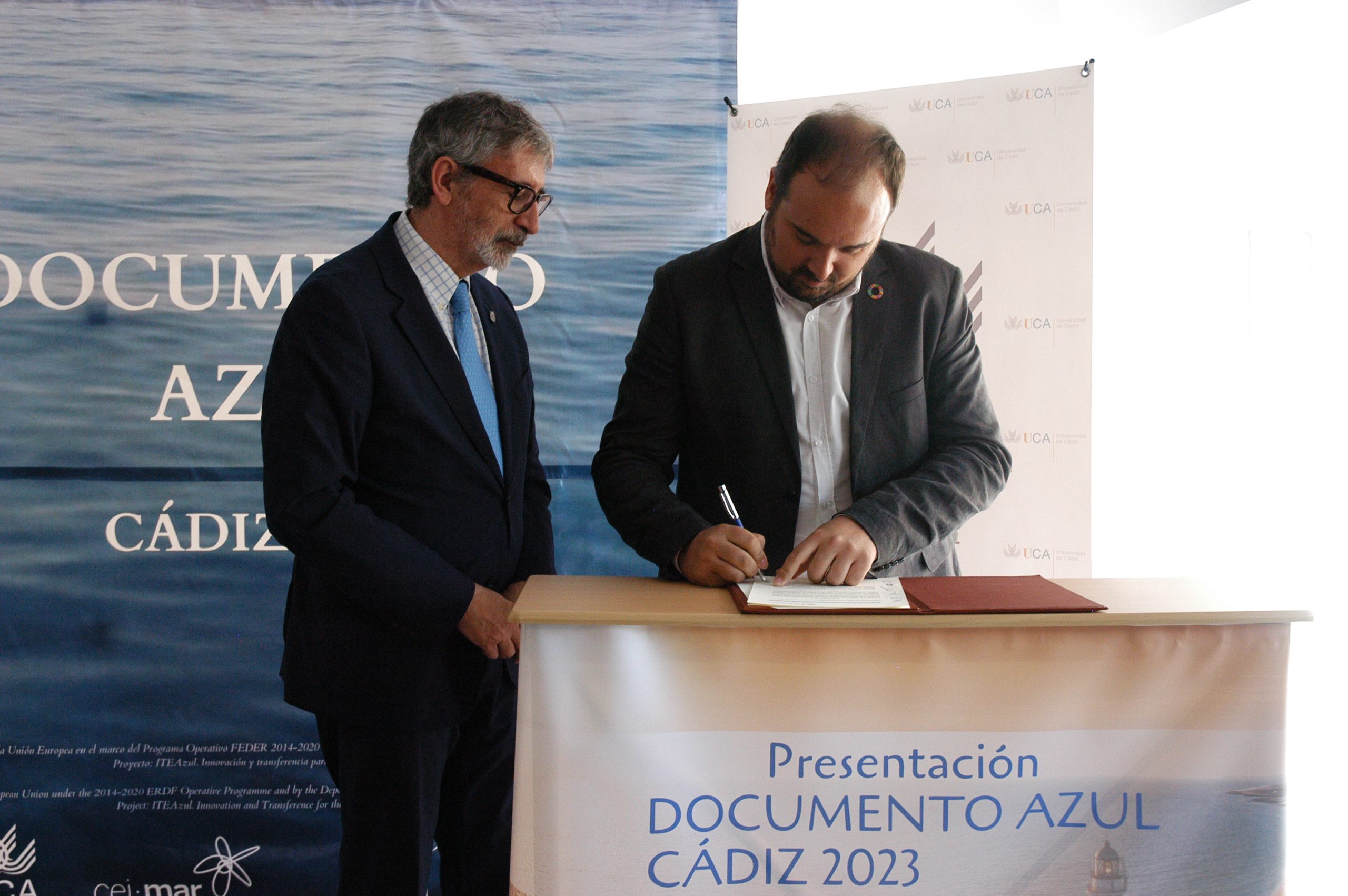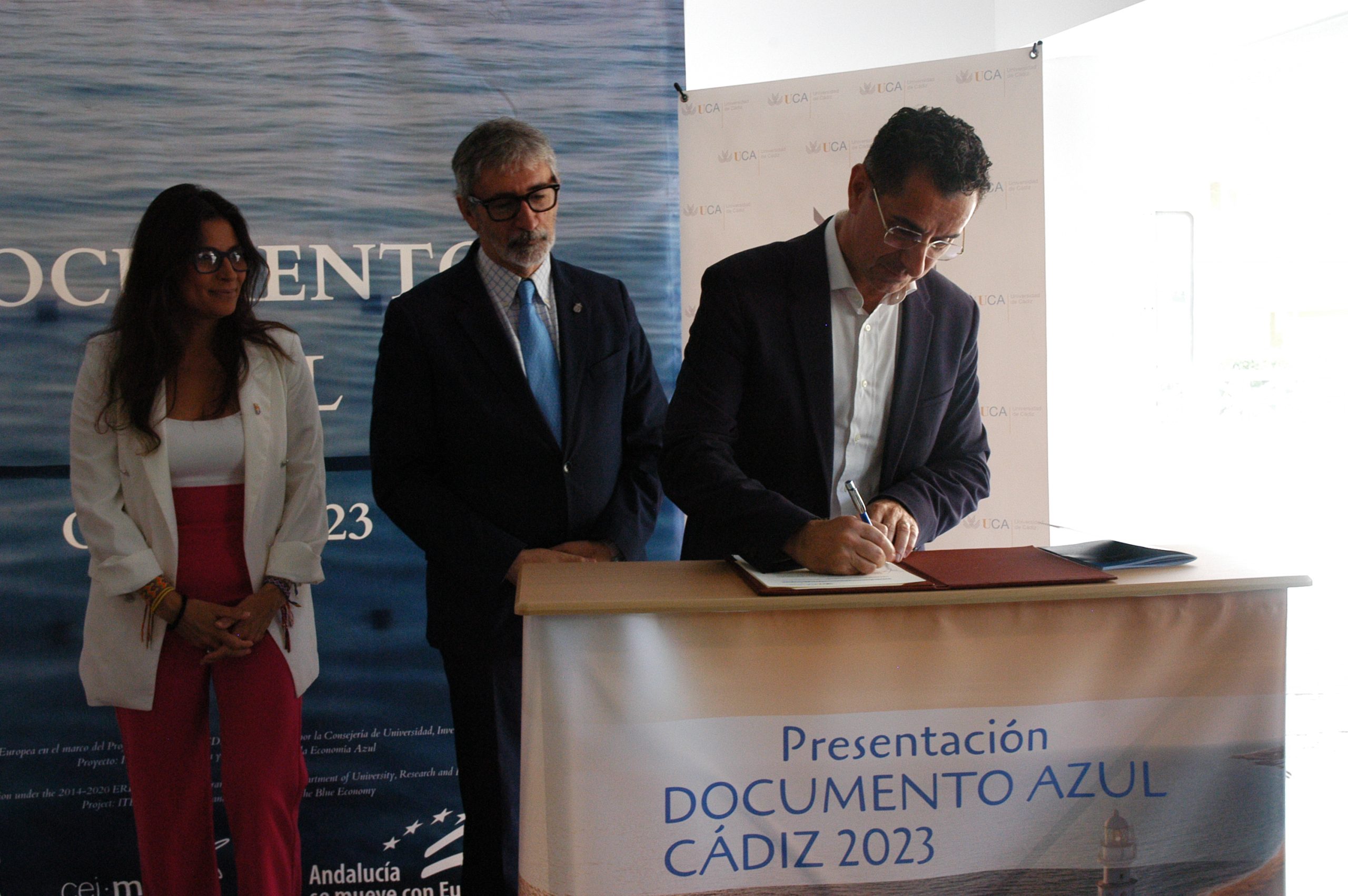 La Universidad de Cádiz ha impulsado la firma de la Carta de Adhesión al ‘Documento Azul Cádiz 2023’ gracias al trabajo conjunto con la Diputación Provincial de Cádiz y los ayuntamientos costeros de la provincia junto a la Junta de Andalucía y en el marco del II Encuentro Internacional sobre Crecimiento y Economía Azul (InnovAzul). El rector de la UCA, Francisco Piniella, ha presidido el acto, en compañía del alcalde de Cádiz, José María González, el vicepresidente primero de la Diputación Provincial de Cádiz, José María Román, los delegados territoriales de la Junta de Andalucía en Cádiz, Isabel Paredes (Universidad, Investigación e Innovación) y Óscar Curtido (Sostenibilidad, Medio Ambiente y Economía Azul), y la vicerrectora de Política Científica y Tecnológica de la UCA, María Jesús Mosquera.