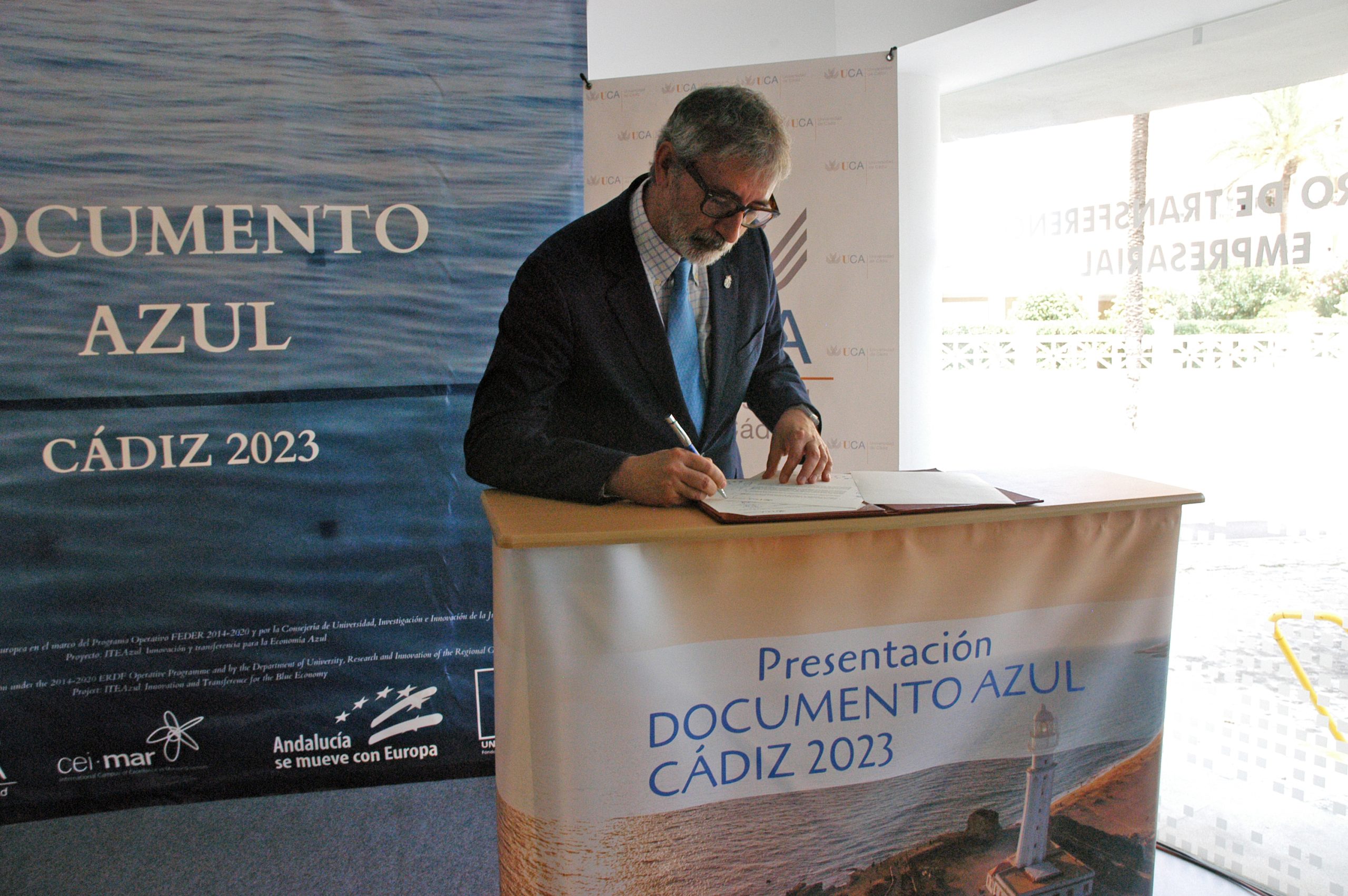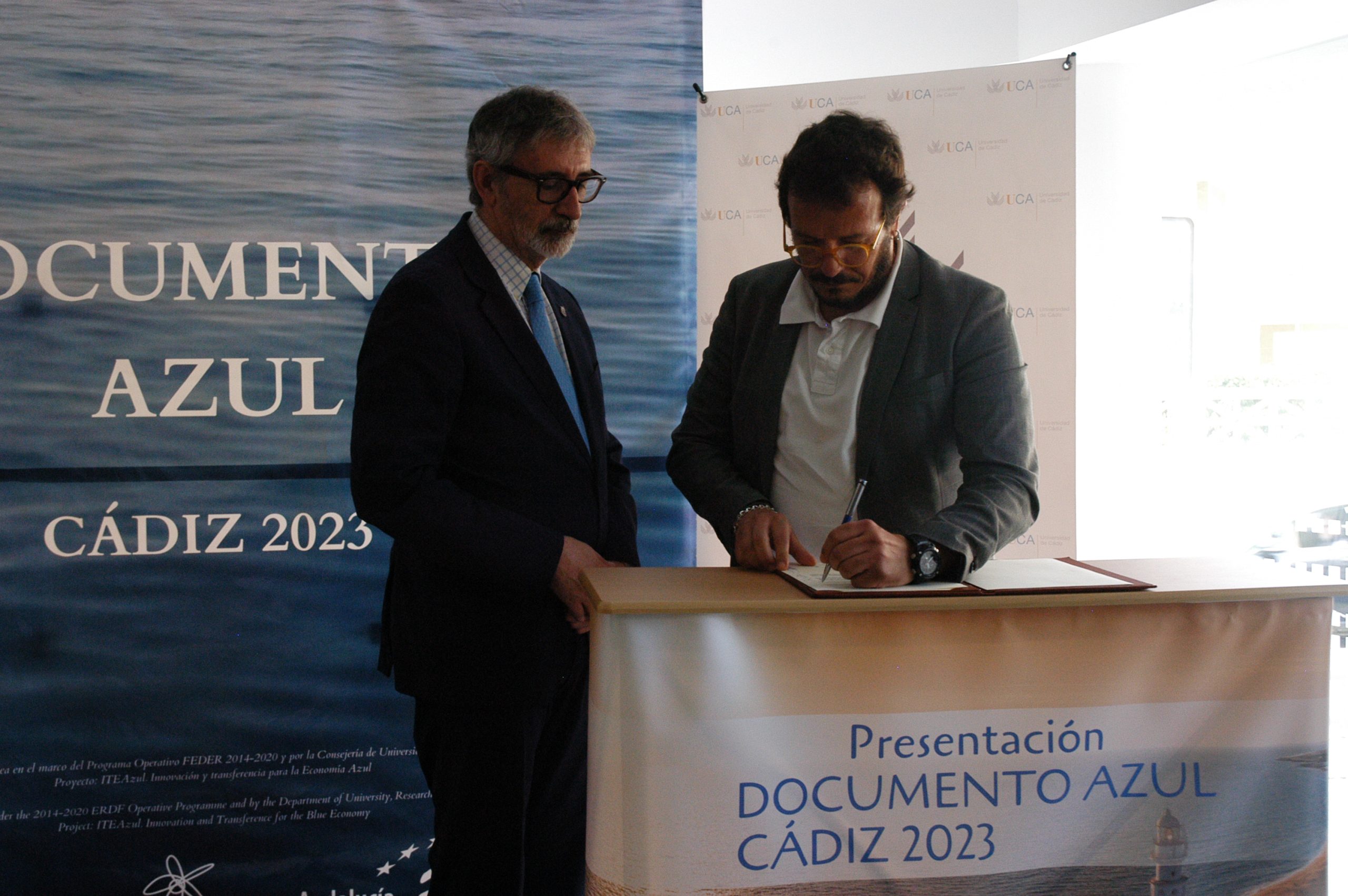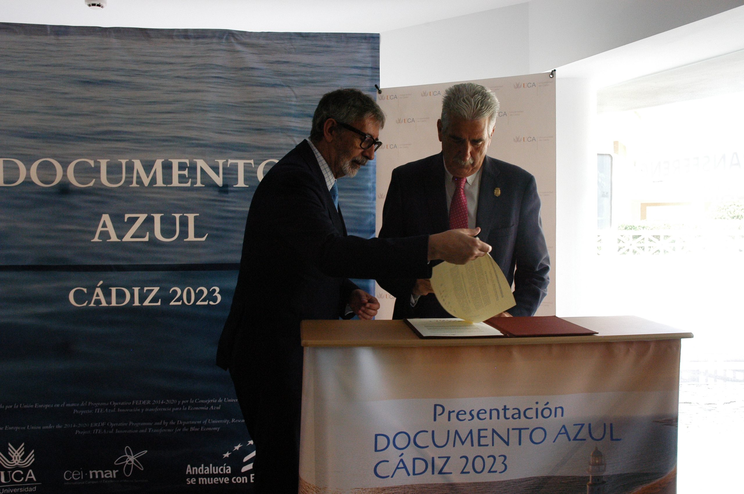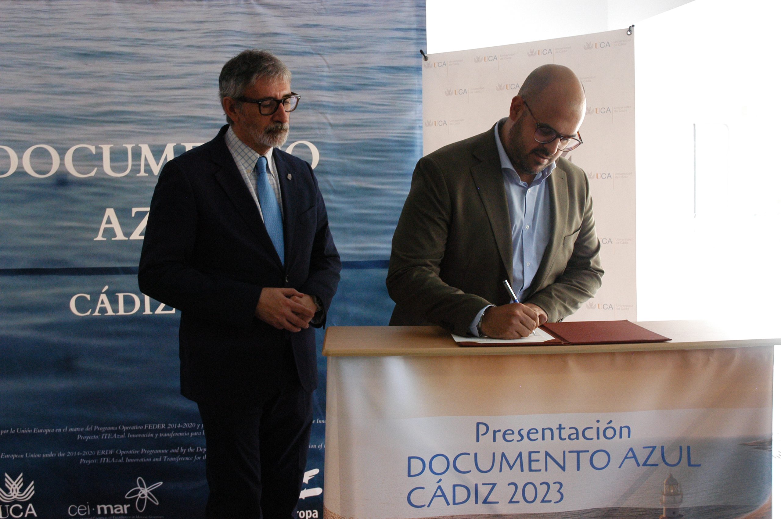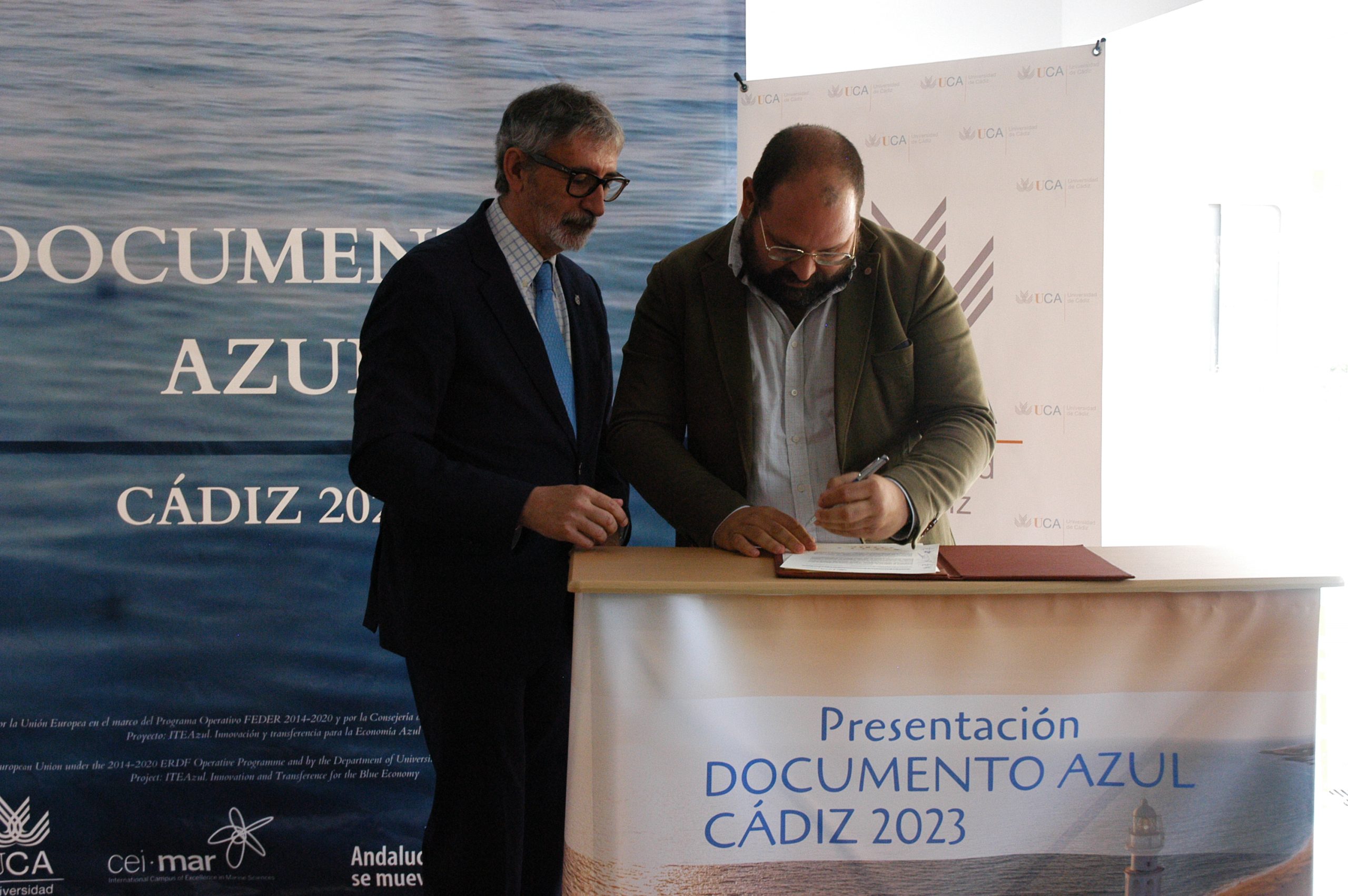 La Universidad de Cádiz ha impulsado la firma de la Carta de Adhesión al ‘Documento Azul Cádiz 2023’ gracias al trabajo conjunto con la Diputación Provincial de Cádiz y los ayuntamientos costeros de la provincia junto a la Junta de Andalucía y en el marco del II Encuentro Internacional sobre Crecimiento y Economía Azul (InnovAzul). El rector de la UCA, Francisco Piniella, ha presidido el acto, en compañía del alcalde de Cádiz, José María González, el vicepresidente primero de la Diputación Provincial de Cádiz, José María Román, los delegados territoriales de la Junta de Andalucía en Cádiz, Isabel Paredes (Universidad, Investigación e Innovación) y Óscar Curtido (Sostenibilidad, Medio Ambiente y Economía Azul), y la vicerrectora de Política Científica y Tecnológica de la UCA, María Jesús Mosquera.