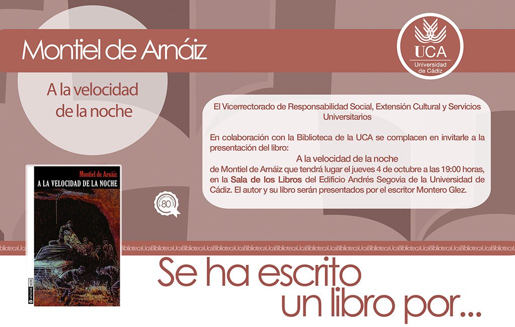 La sala de los Libros del edificio Andrés Segovia en el Campus de Cádiz será el escenario que acogerá sendas convocatorias, a las 19 horas. En primer lugar, hoy martes 2 de octubre, se presentará la obra Barro, pólvora y sangre de José Antonio López Fernández. Y en segundo, el próximo jueves 4, se presentará el libro A la velocidad de la noche de Montiel de Arnáiz.