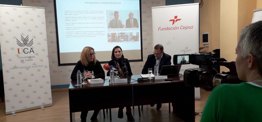 La Cátedra Fundación Cepsa de la Universidad de Cádiz ha presentado hoy la memoria de sus actividades en 2018. Su coordinador, el profesor Francisco Trujillo, junto a la delegada del Rector para el Campus Bahía de Algeciras, Inmaculada Santiago, y en compañía de la responsable de Comunicación y RRII en la refinería CEPSA de San Roque, Estrella Blanco, han presidido el acto en el Campus Bahía de Algeciras.