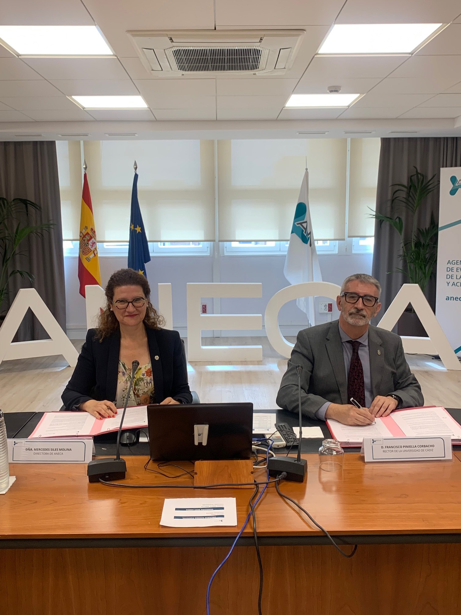 La directora de la Agencia Nacional de Evaluación de la Calidad y Acreditación, Mercedes Siles, y el rector de la UCA, Francisco Piniella, han firmado hoy un convenio de colaboración