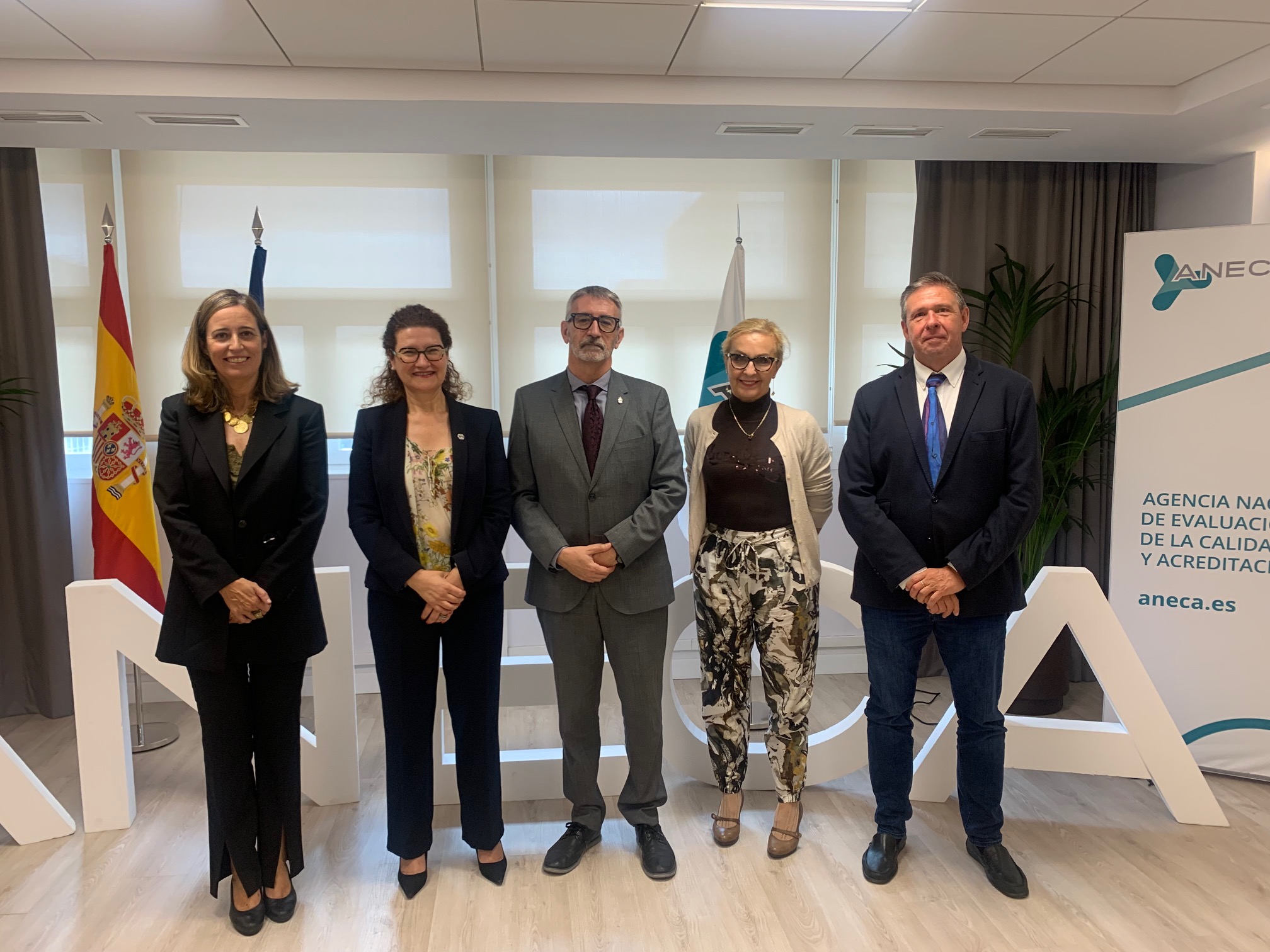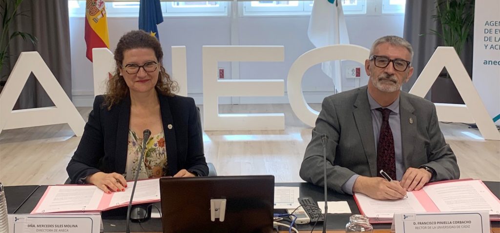 La Agencia Nacional de Evaluación de la Calidad y Acreditación (ANECA) y la Universidad de Cádiz han suscrito un convenio por el que ANECA evaluará las solicitudes presentadas para los programas del Plan de Carrera Investigadora de Excelencia (CIE) de la Universidad de Cádiz, denominados UCA INTEGRA y UCA ESTABILIZA, conforme a las sucesivas convocatorias que se publiquen. El rector de la UCA, Francisco Piniella, y la directora de la Agencia Nacional de Evaluación de la Calidad y Acreditación, Mercedes Siles, han presidido hoy la firma en su sede en Madrid, acompañados por la vicerrectora de Política Científica y Tecnológica y el director General de Capital Humano Investigador de la UCA, Mª Jesús Mosquera y José María Rodríguez-Izquierdo, respectivamente, y la gerente de la Agencia, Asunción López.