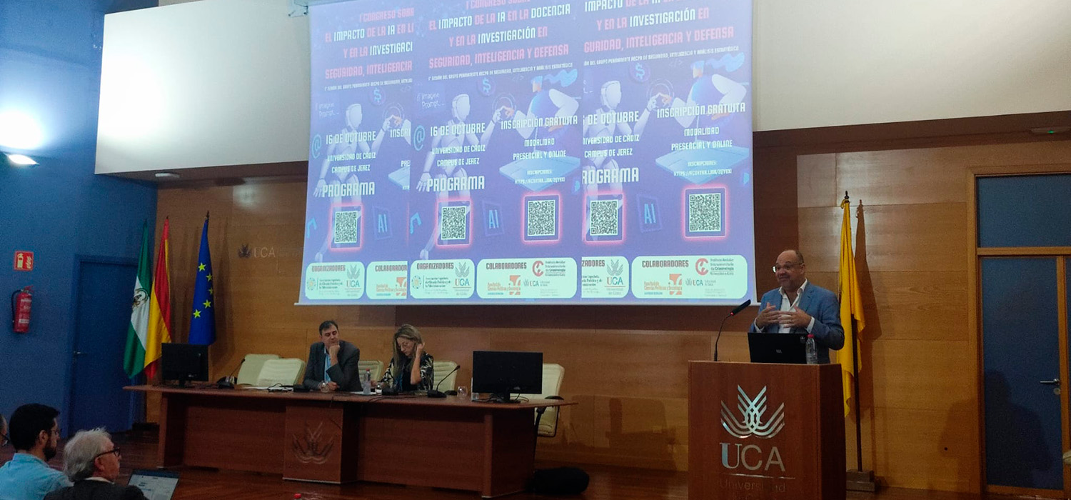 El salón de actos de la Facultad de Derecho del Campus de Jerez ha acogido este jueves el I Congreso sobre el impacto de la Inteligencia Artificial (IA) en la docencia y la investigación en seguridad, inteligencia y defensa, una cita académica que se ha celebrado tanto en formato presencial como online. La actividad ha sido organizada por el Grupo Permanente de la AECPA Seguridad, Inteligencia y Análisis Estratégico y el Grupo de Investigación SEJ-378 de la Facultad de Derecho de la Universidad de Cádiz, con la colaboración del Instituto Andaluz Interuniversitario de Criminología (Sección Cádiz), la propia Facultad de Derecho, el Vicerrectorado de Investigación y Transferencia de la UCA y la Facultad de Ciencias Políticas y Sociología de la Universidad de Granada.