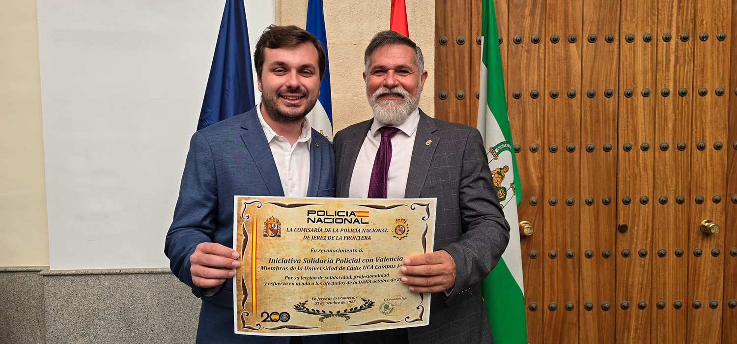 El premio ha sido concedido por parte de la Comisaría de la Policía Nacional de Jerez, en el marco de la Iniciativa Solidaria Policial con Valencia, a integrantes del Campus de Jerez de la Universidad de Cádiz. El presidente del Consejo de Estudiantes de la UCA (CEUCA), Gonzalo Santiago, se ha encargado de recoger el diploma, como representante del alumnado, que reconoce la lección solidaria, profesionalidad y el esfuerzo mostrado para asistir a las personas afectadas por la DANA.