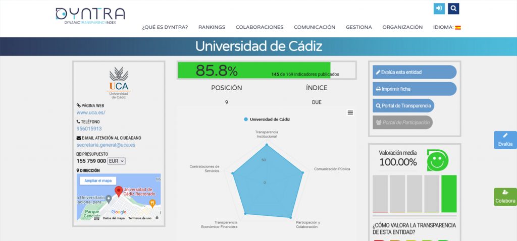 La Universidad de Cádiz se sitúa nuevamente entre las más transparentes de España, consolidándose en el top 10 de las instituciones universitarias españolas que ofrecen más y mejor información pública y en detalle sobre distintos aspectos relacionados con su funcionamiento. De este modo y según los datos que arroja el ranking DYNTRA (Dynamic Transparency Index), la UCA aparece en la novena entre las 77 instituciones universitarias analizadas.