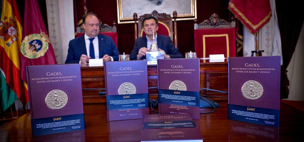El Salón de Plenos del Ayuntamiento de Cádiz ha acogido este miércoles la presentación oficial de la monografía Gades, Municipium Civium Romanorum. Entre los Balbo y Avieno, una de las principales aportaciones académicas de la segunda edición del programa Cádiz Romana, que se desarrollará en la ciudad entre el 19 y el 28 de septiembre. Los autores de la obra son José María Gener Basallote, arqueólogo del Ayuntamiento de Cádiz; Laura Esparragosa, directora del Museo de Cádiz, de la Consejería de Cultura y Deporte de la Junta de Andalucía; y Darío Bernal Casasola, catedrático de Arqueología de la Universidad de Cádiz.