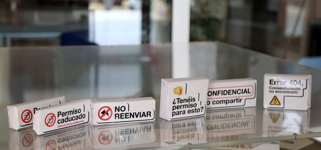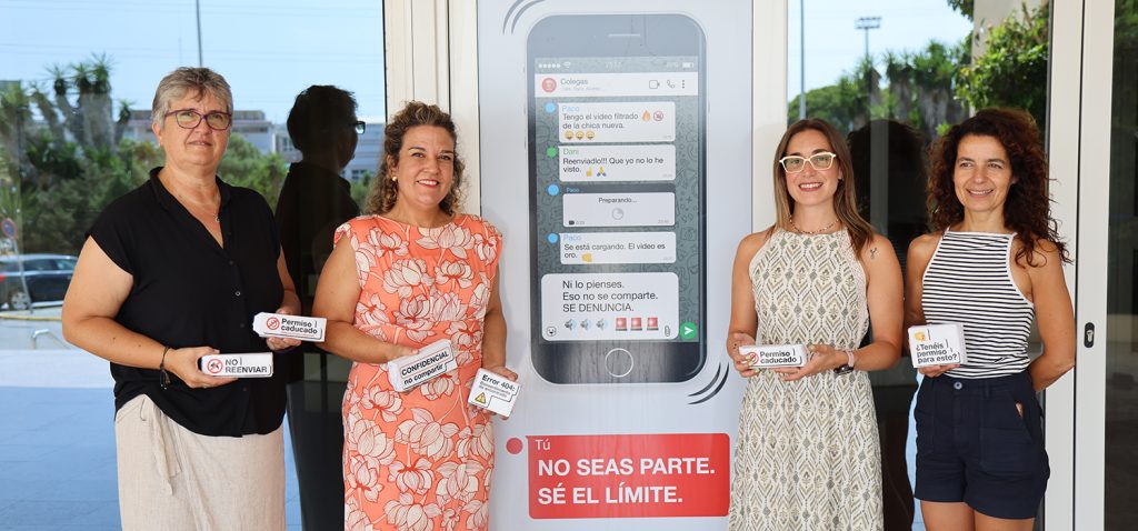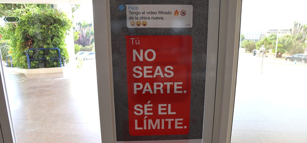 En las puertas de los centros del campus de Puerto Real pueden leerse mensajes como “Tú no seas parte, sé el límite”, “¿Tenéis permiso para eso?” o “Confidencial, no compartir”. Esta intervención ha sido financiada con fondos procedentes del Pacto de Estado contra la Violencia de Género, canalizados a través del Ministerio de Igualdad (Secretaría de Estado de Igualdad y contra la Violencia de Género).