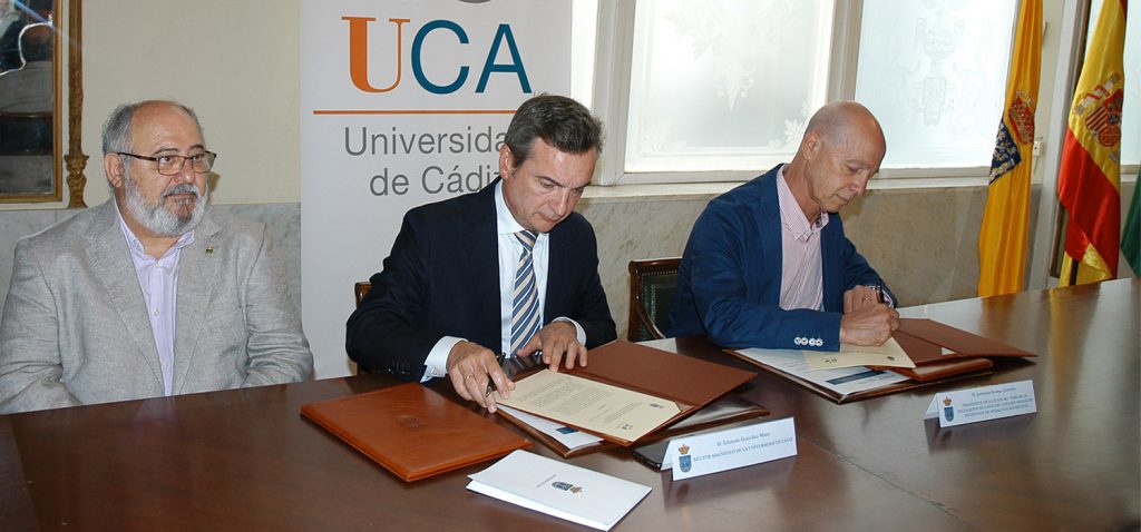 El rector de la Universidad de Cádiz, Eduardo González Mazo, y el presidente del Colegio Oficial de Psicología de Andalucía Occidental, Jerónimo Acosta, en compañía del decano de la Facultad de Ciencias de la Educación, Manuel García Sedeño, han firmado en el Rectorado un protocolo general de colaboración y un convenio específico para la puesta en marcha del Aula universitaria de Psicología de la UCA.