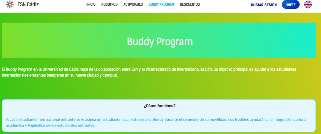 La asociación Erasmus Student Network (ESN), en colaboración con el Vicerrectorado de Internacionalización de la Universidad de Cádiz convocan el proyecto Buddy, que se dirige al alumnado UCA y busca la mejor integración de sus estudiantes Erasmus en la comunidad universitaria.