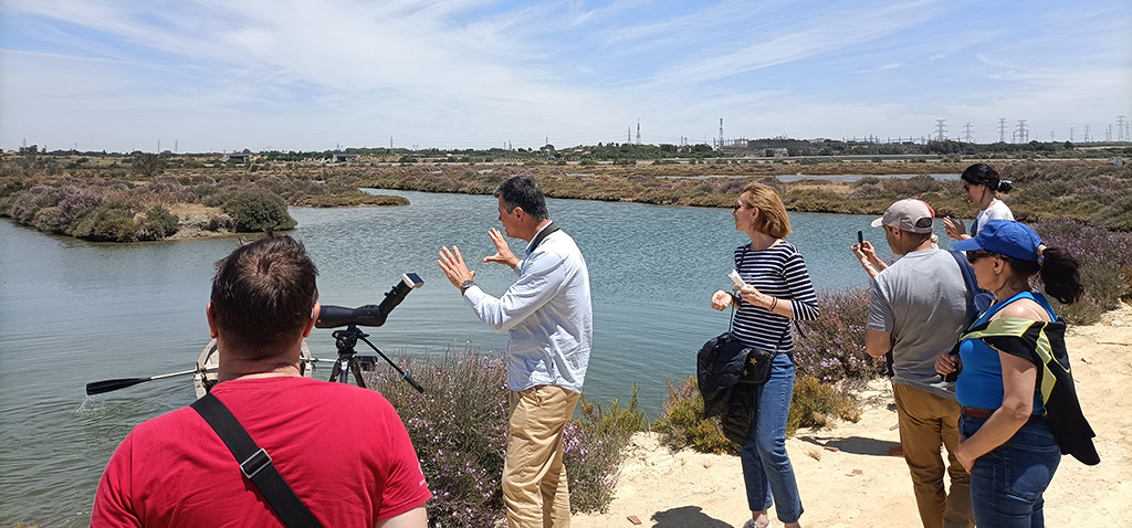Tras los encuentros más teóricos de estos días en el edificio Constitución 1812 del Campus de Cádiz, el grupo de investigadores internacional y multidisciplinar asistente ha realizado una salida a campo para visitar el caso de estudio de la Bahía de Cádiz, punto caliente de biodiversidad y donde tienen lugar actividades tradicionales que conviven con ésta. Para ello, la salida fue guiada por la ONG Salarte y se centró en conocer la parte social y natural de la Bahía, para lo que se recorrieron distintos lugares clave terminando la salida en la salina ‘La Balbanera’; en la que se realizó una explicación demostrativa de las actividades tradicionales que se llevan a cabo en este espacio natural.