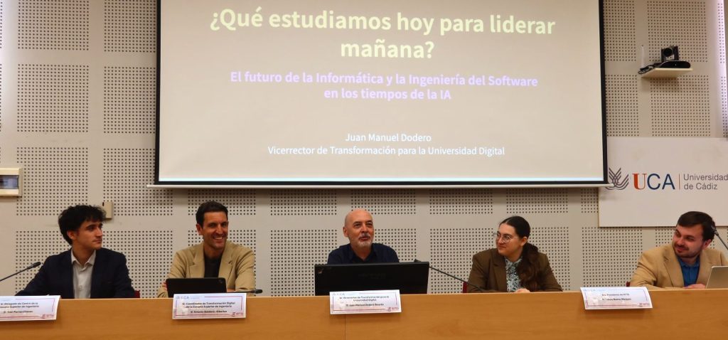 El acto de inauguración se ha desarrollado en el Edificio Constitución 1812 y ha contado con la participación del vicerrector de Transformación para la Universidad Digital, Juan Manuel Dodero, que ha impartido la conferencia ¿Qué estudiamos hoy para liderar mañana? Junto a él han intervenido el coordinador de Transformación Digital de la Escuela Superior de Ingeniería, Antonio Balderas; el delegado de Centro de la ESI, Iván Parrao; la presidenta de RITSI, Laura Baena; y el presidente del Consejo de estudiantes, Gonzalo Santiago, encargado de abrir el acto y presentar a los intervinientes .