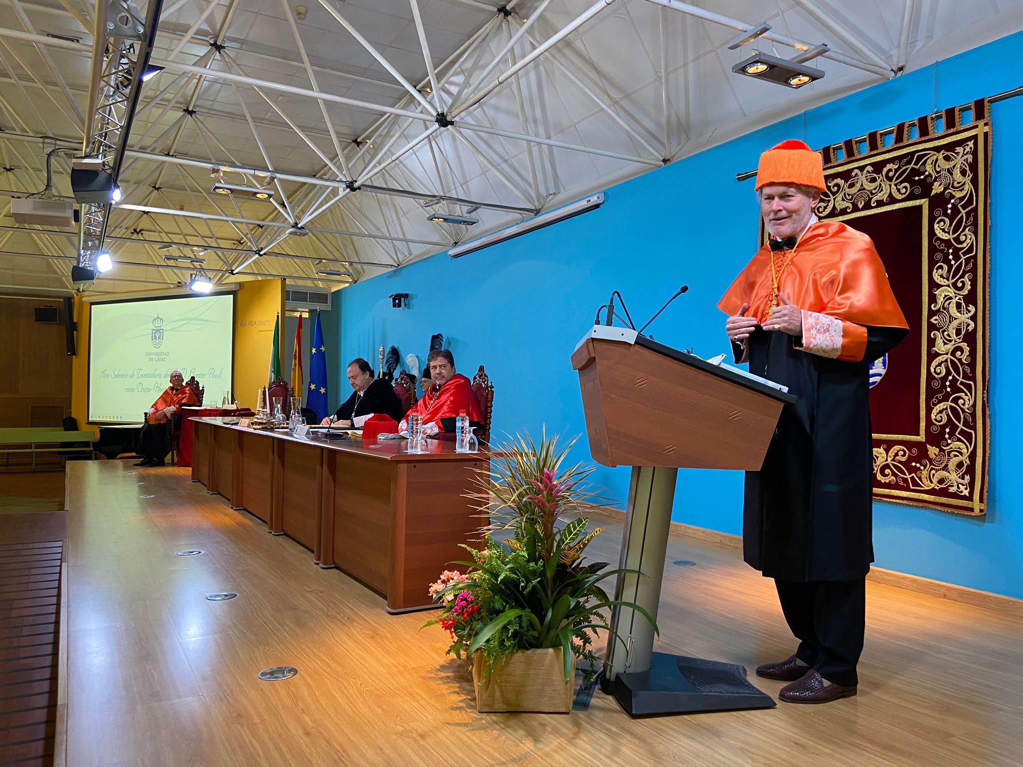 Por su parte, el profesor Pedro Araujo ha glosado la figura y los múltiples méritos contraídos por Gunter Pauli para ingresar como doctor Honoris Causa en el Claustro de la Universidad de Cádiz, entre ellos, “ser considerado internacionalmente como el “padre”, o al menos uno de ellos, de la Economía Azul. Aunque nacido en Amberes, Bélgica, realmente se le puede considerar ciudadano del mundo, tanto por su dominio de siete idiomas, entre ellos el español, como por haber vivido en ciudades de cuatro continentes”. A lo largo de las últimas décadas, “ha desarrollado una prolífica trayectoria profesional internacional llevando siempre en paralelo sus vocaciones como emprendedor y como autor con su extraordinario compromiso con la cultura, la política, la sociedad y el medio ambiente”.