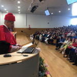 Un “GRACIAS en mayúscula” dedicado: “a la persona que nos limpia nuestro despacho, a la que nos pone el café con una sonrisa a las ocho de la mañana, a la profesora o al profesor que viene a dar la clase temprano cuando esa noche ha tenido que estar cuidando de su hijo pequeño, al bibliotecario que nos encuentra ese manual que buscábamos, al conserje de la facultad, a los estudiantes que son el alma de nuestra universidad y, especialmente, a los que jugáis el importante papel de defender vuestros derechos, el CEUCA, a nuestra gestora, al gabinete del Rector que viene hoy aunque sea festivo, a la coral que siempre nos llena de alegría con sus cánticos, a los decanos, a los directores, a la inspección general, a la defensora universitaria, a todos, a todas, también a los representantes de los trabajadores que nos recuerdan que mejorar la calidad de la universidad no debe estar reñido con mejorar las condiciones laborales de todos”. A la Junta de Andalucía, en este caso con la presencia de su consejero, y a todas las instituciones y entidades que colaboran con la Universidad de Cádiz, a la gerente y al personal de Administración y Servicios “por cuidar del dinero que es público, el dinero que nuestra sociedad pone en nuestras manos para emplearlo exclusivamente en los fines públicos para los que las universidades fueron creadas”.