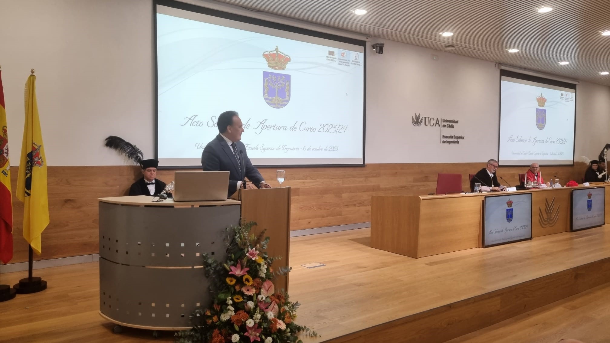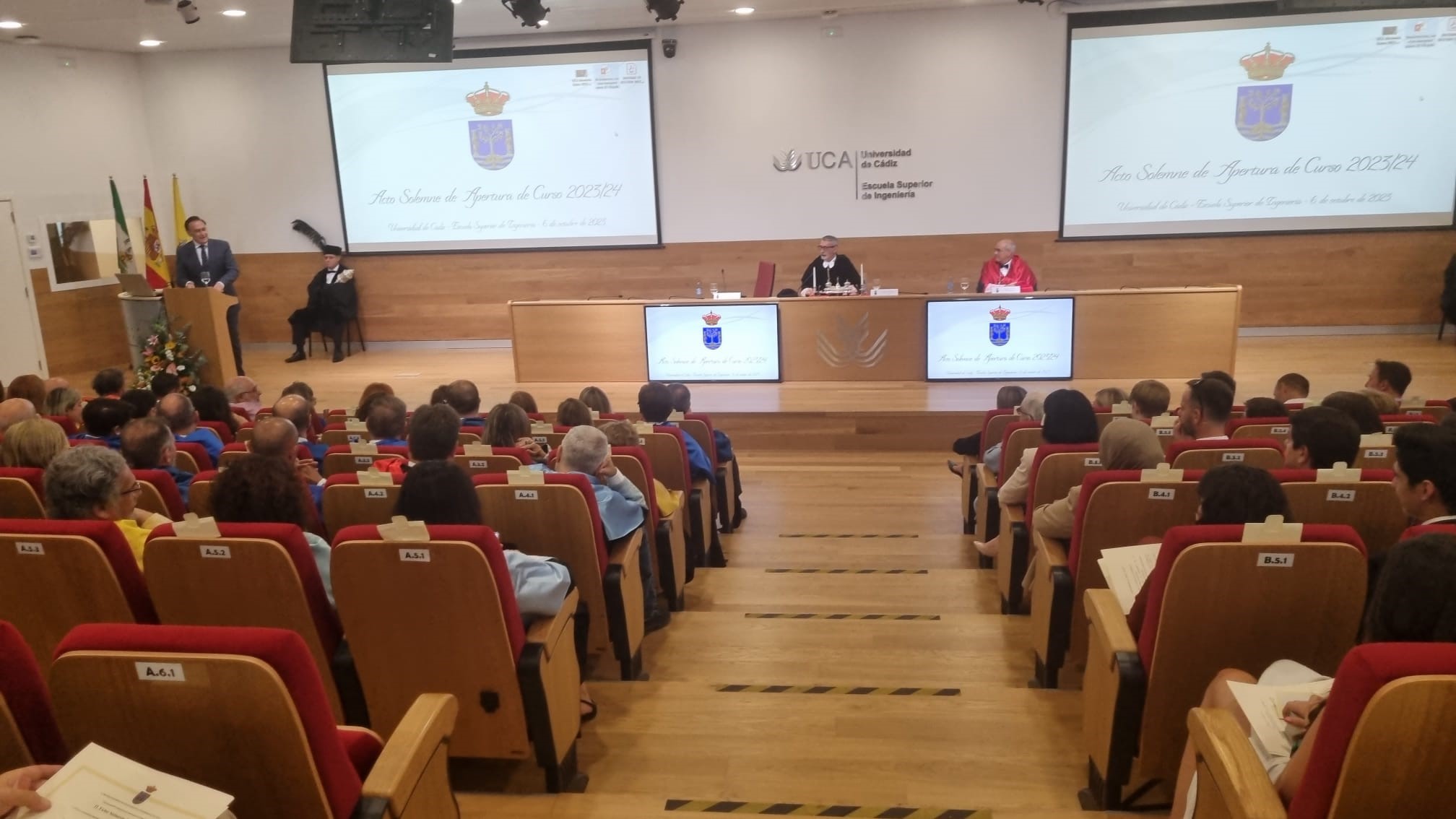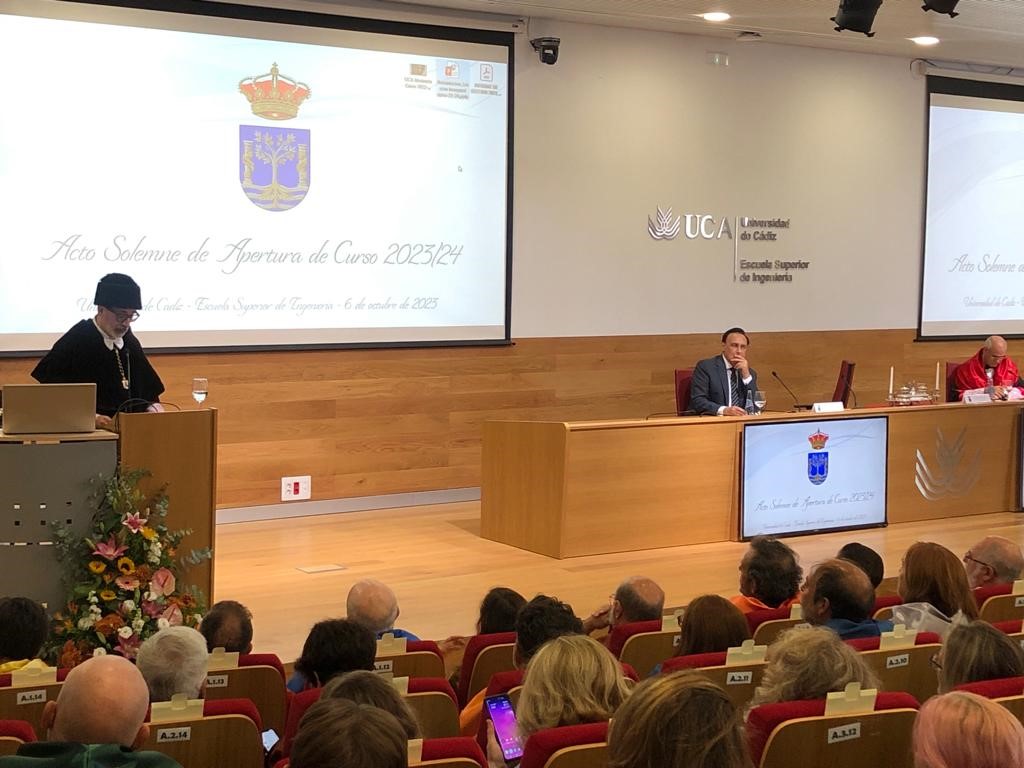 La Universidad de Cádiz ha celebrado la sesión solemne de Apertura del Curso Académico 2023-2024. El rector en funciones de la UCA, Francisco Piniella, en compañía del consejero de Universidad, Investigación e Innovación de la Junta de Andalucía, José Carlos Gómez Villamandos, han presidido el acto en el salón de Actos de la Escuela Superior de Ingeniería del Campus de Puerto Real, que ha contado con la presencia de representantes de la comunidad universitaria, de autoridades civiles y militares, así como agentes sociales y económicos de la provincia de Cádiz.